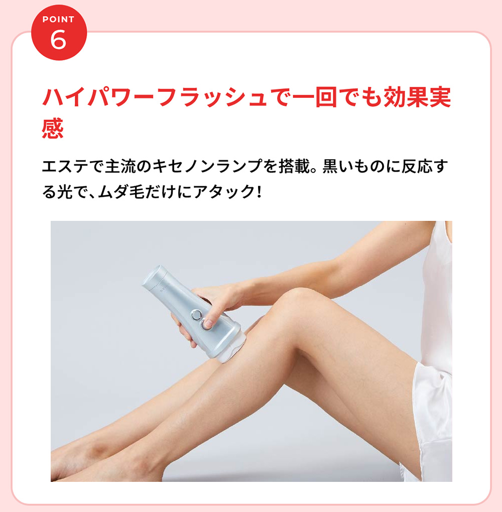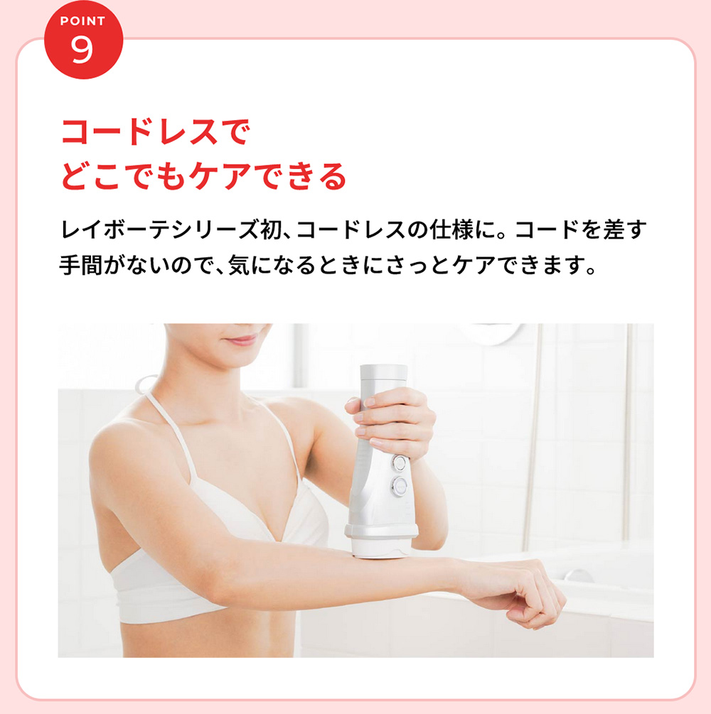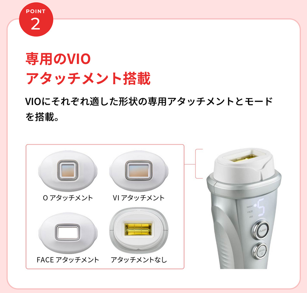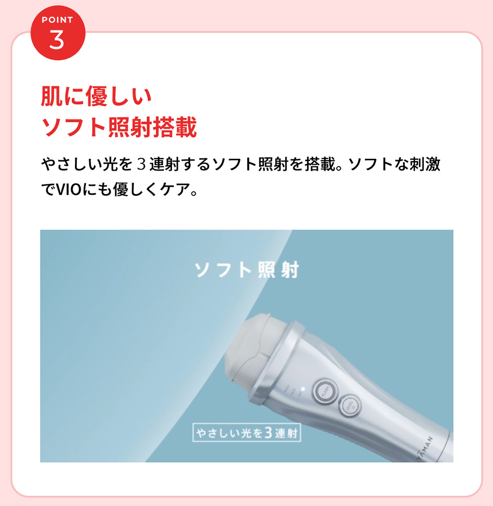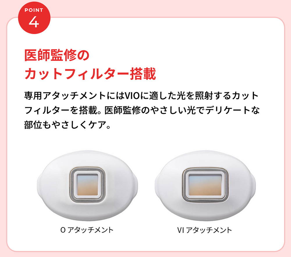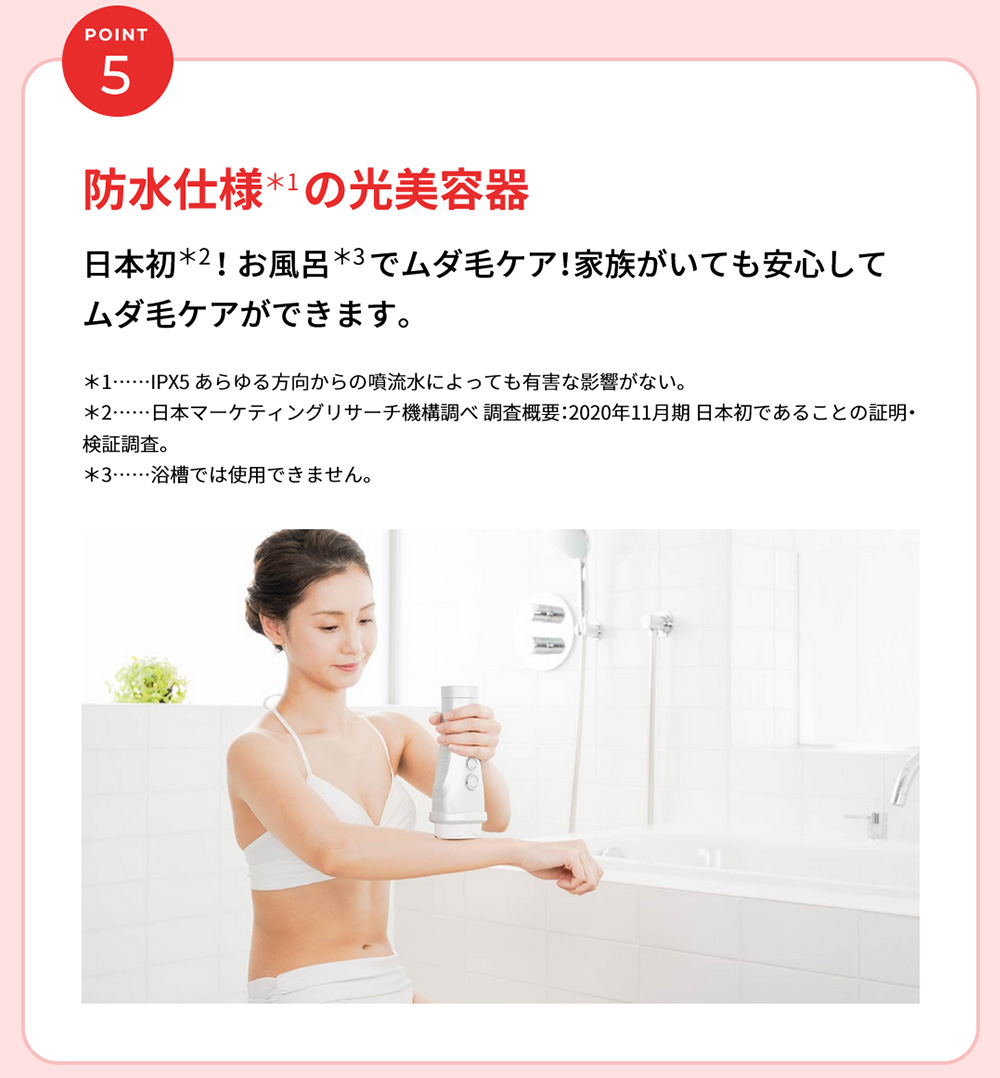 日本初(*1)お風呂(*2)でVIOもケア。 医師監修のもとVIOケアに適した専用アタッチメントで光を照射するカットフィルター搭載のモデル。 ハイパワーでも優しい光を3連射するソフト照射でさらにやさしくVIOケアを。 *1 日本マーケティング・リサーチ機構調べ 調査概要:2020年11月期 日本初であることの証明・検証調査 *2 浴槽では使用できません