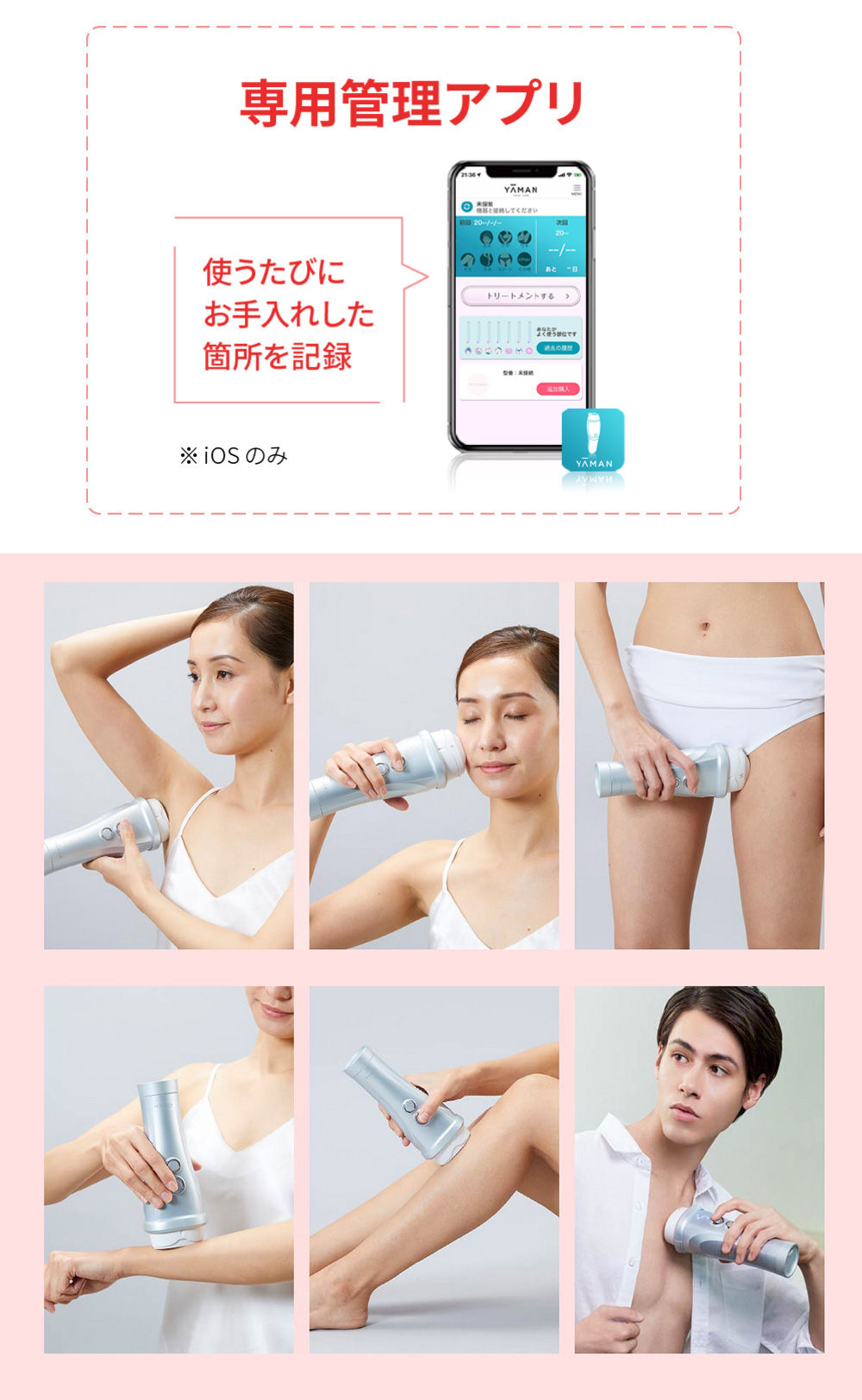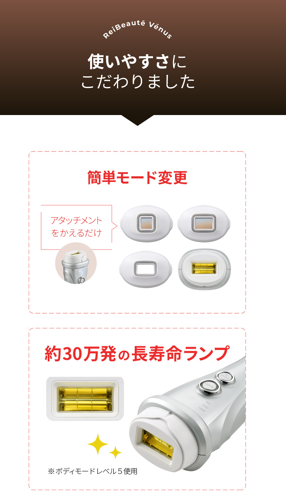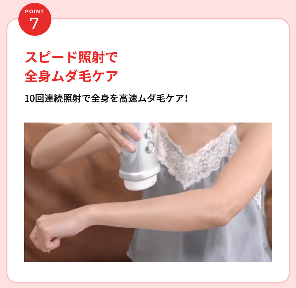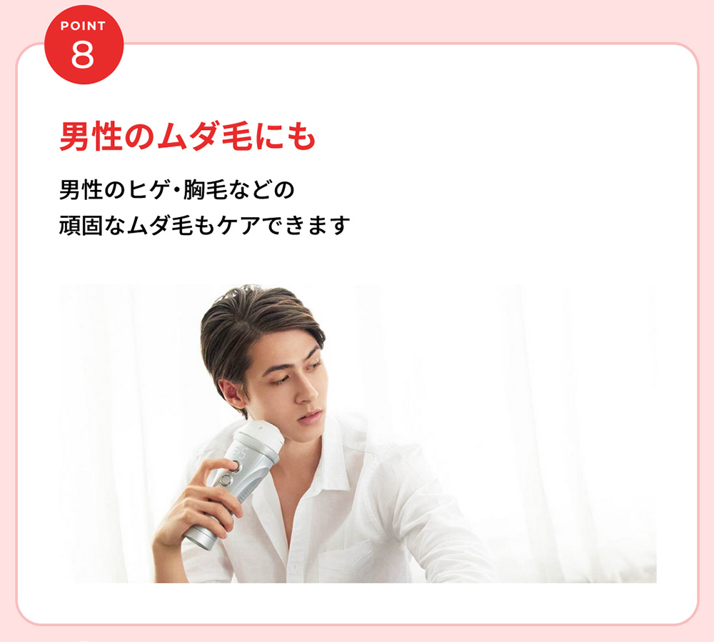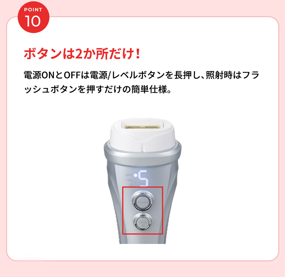 日本初(*1)お風呂(*2)でVIOもケア。 医師監修のもとVIOケアに適した専用アタッチメントで光を照射するカットフィルター搭載のモデル。 ハイパワーでも優しい光を3連射するソフト照射でさらにやさしくVIOケアを。 *1 日本マーケティング・リサーチ機構調べ 調査概要:2020年11月期 日本初であることの証明・検証調査 *2 浴槽では使用できません