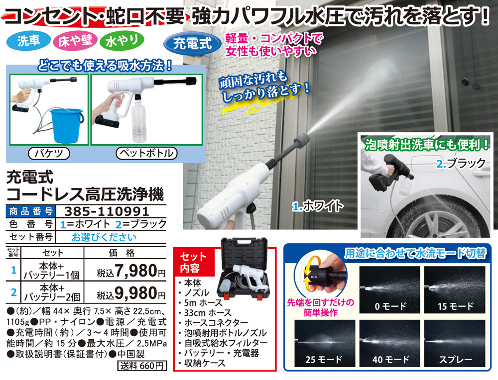 軽量・コンパクトで女性も使いやすい 頑固な汚れもしっかり落とす! ◎洗車 ◎床や壁 ◎水やり ◎充電式 泡噴射出洗車にも便利! 【セット内容】 ・本体 ・ノズル ・5mホース ・33cmaホース ・ホースコネクター ・泡噴射用ボトルノズル ・自吸式給水フィルター ・バッテリー・充電器 ・収納ケース