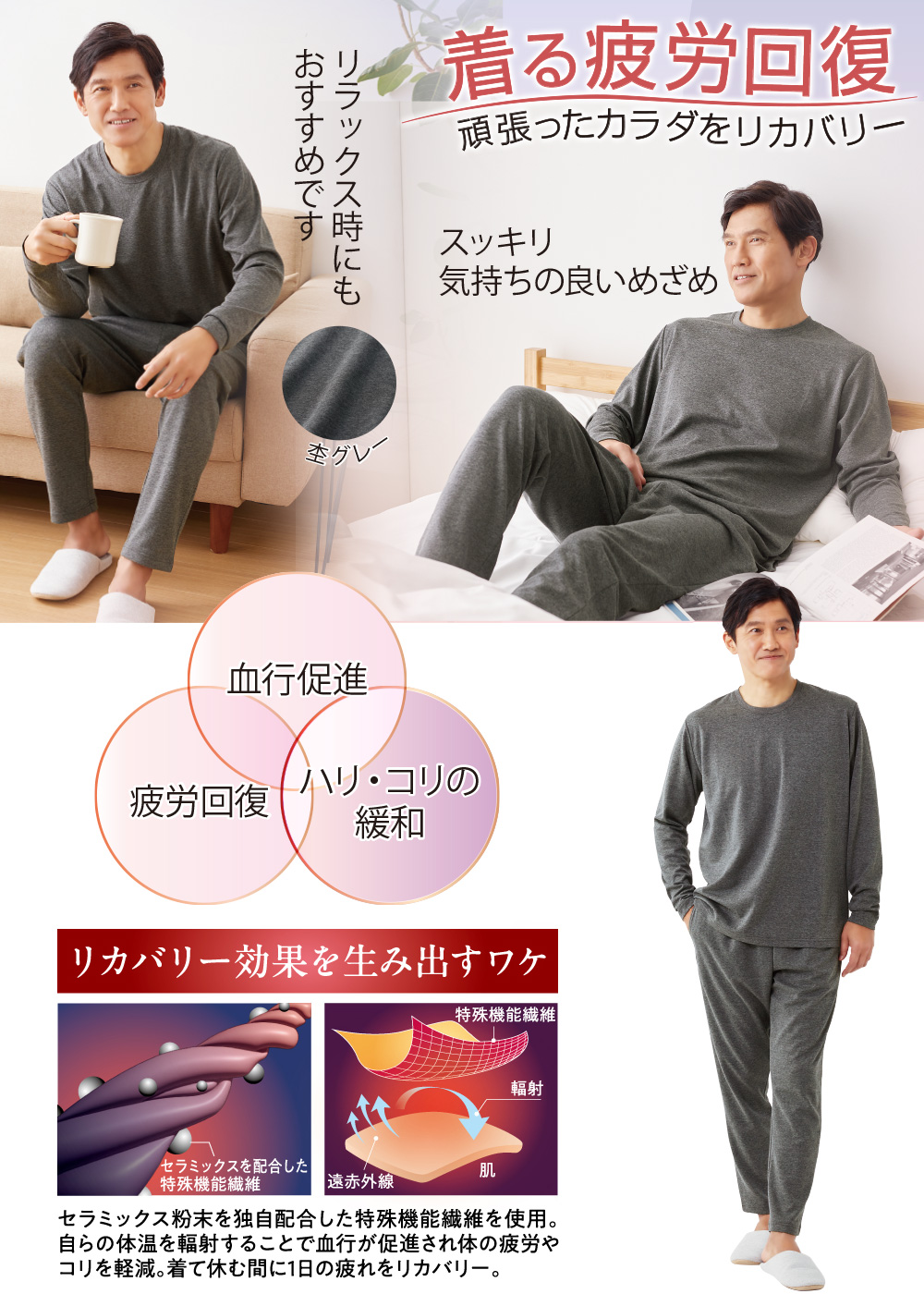 セラミックス粉末を独自配合した特殊機能繊維を使用。自らの体温を輻射することで血行が促進され体の疲労やコリを軽減。着て休む間に1日の疲れをリカバリー。