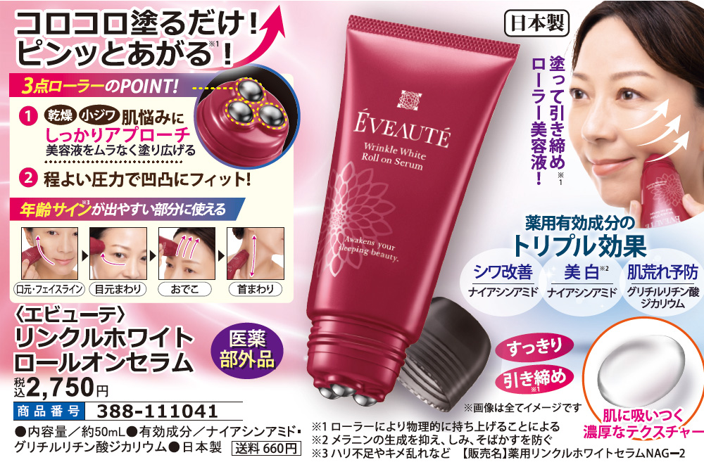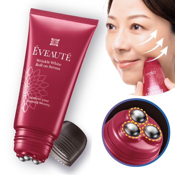 コロコロ塗るだけ!ピンッとあがる!(※1) 小ジワ・乾燥・肌悩みにしっかりアプローチ! 美容液をムラなく塗り広げる。 程よい圧力で凹凸にフィット! ※1 ローラーにより物理的に持ち上げることによる