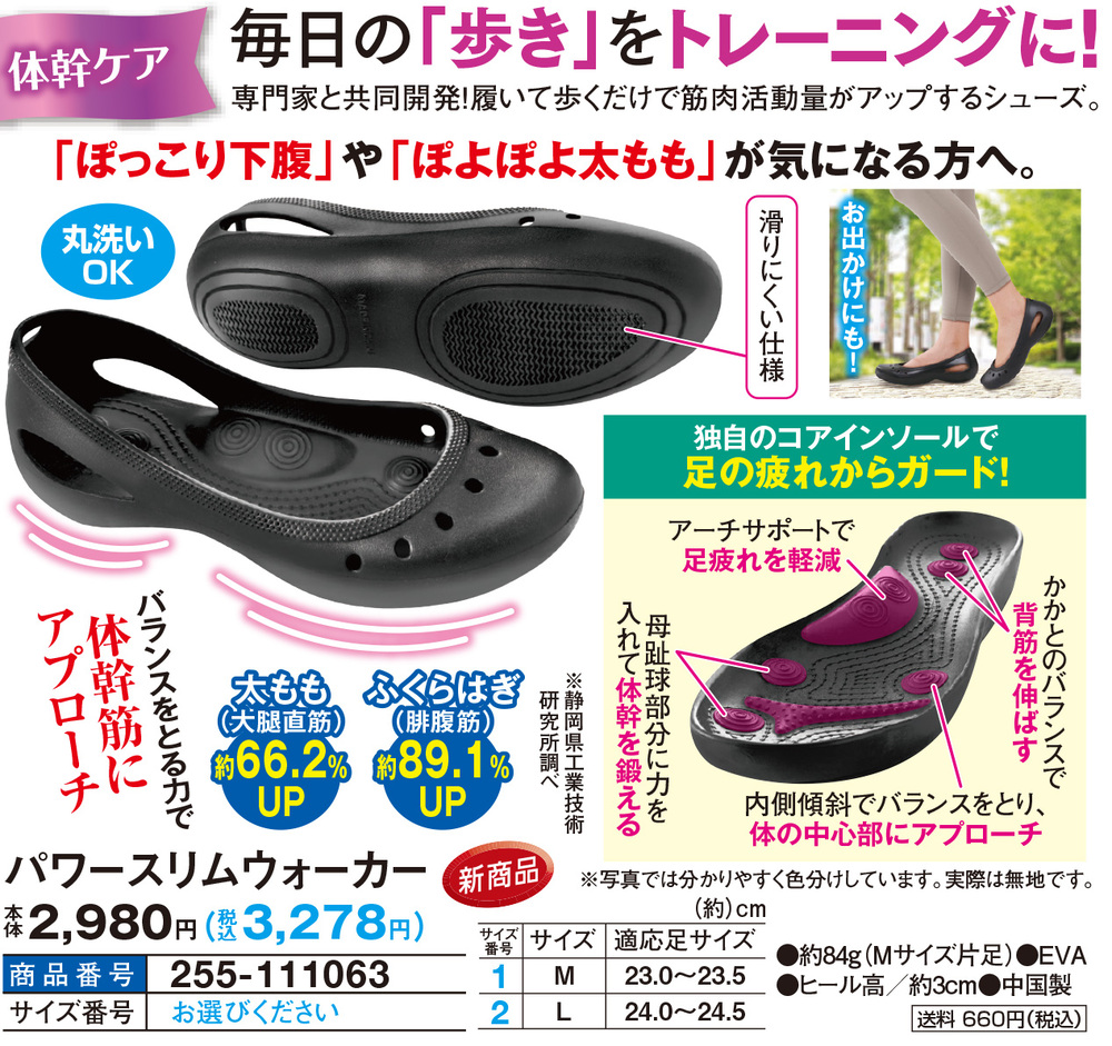 毎日の「歩き」をトレーニングに! 専門家と共同開発!履いて歩くだけで筋肉活動量がアップするシューズ。 「ぽっこり下腹」や「ぽよぽよ太もも」が気になる方へ。 【バランスをとる力で体幹筋にアプローチ】 太もも(大腿直筋) 約66.2%UP ふくらはぎ(腓腹筋) 約89.1%UP 【独自のコアインソールで足の疲れからガード!】 ●アーチサポートで足疲れを軽減 ●母趾球部分に力を入れて体幹を鍛える ●かかととのバランスで背筋を伸ばす ●内側傾斜でバランスをとり、体の中心部にアプローチ ●丸洗いOK ●滑りにくい仕様 ●お出かけにも!