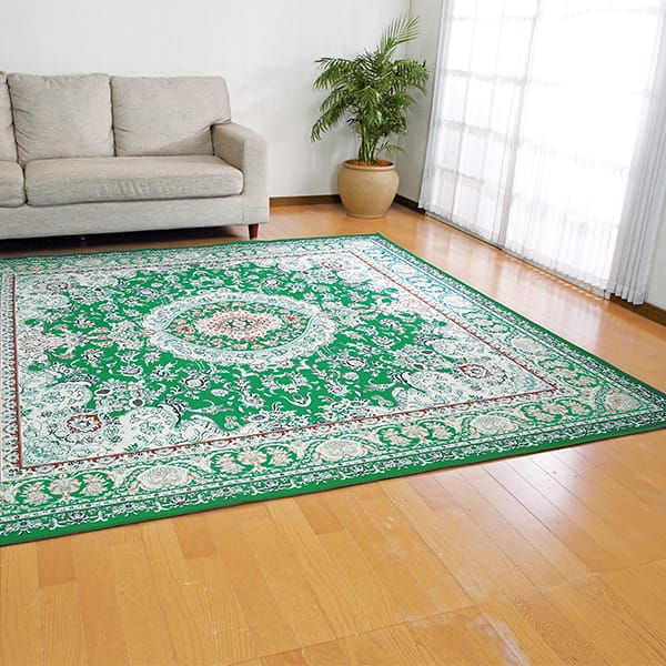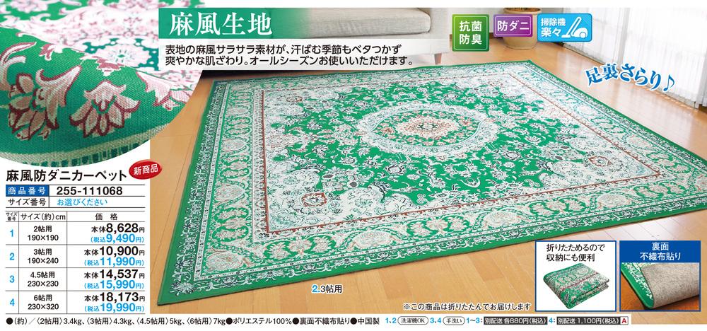 麻風生地! 表地の麻風サラサラ素材が、汗ばむ季節もベタつかず爽やかな肌ざわり。 オールシーズンお使いいただけます。 去年のジメジメ、今年は解消!快適素材のカーペット! 裏面は不織布貼りで足裏さらり♪ ●折りたためるので収納にも便利 ●抗菌防臭 ●防ダニ ●掃除機楽々