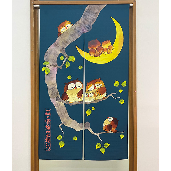 お部屋に合わせて選べるのれん! 【七福ろうの森】 福を呼ぶ七羽のふくろうと仕事運を呼び込む紺色を組み合わせた縁起の良いのれん。