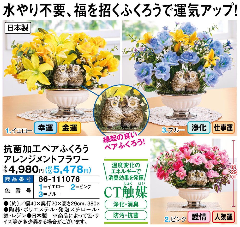 水やり不要、福を招くふくろうで運気アップ! 人気のふくろうが復活! 敬老の日に!贈り物にもおすすめ! 【CT触媒】 温度変化のエネルギーで消臭効果を発揮 ●浄化・消臭 ●防汚・抗菌 【イエロー】 ・幸運 ・金運 【ピンク】 ・愛情 ・人気運 【ブルー】 ・浄化 ・仕事運