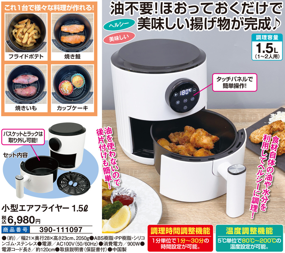 ●火を使わない油を使わないフライヤータッチパネル調理器具 ●食材に含まれている油や水分を利用して油を使わずに調理するので、とってもヘルシー。 ●食材から出た油もフライラックを通してバスケットの底に溜まります。 ●ダイエット中や食生活が気になる方に。 ●面倒な油の処理も不要。 ●周囲に油が飛びはねることも、後処理も必要ないので手間がかかりません。 ●油の処理は面倒くさい!でも揚げ物は食べたい!そんな欲張りさんにもピッタリです。 【調理時間調整機能】1分単位で1分~30分の時間設定が可能。 【温度調整機能】5度単位で80度~200度の温度設定が可能。