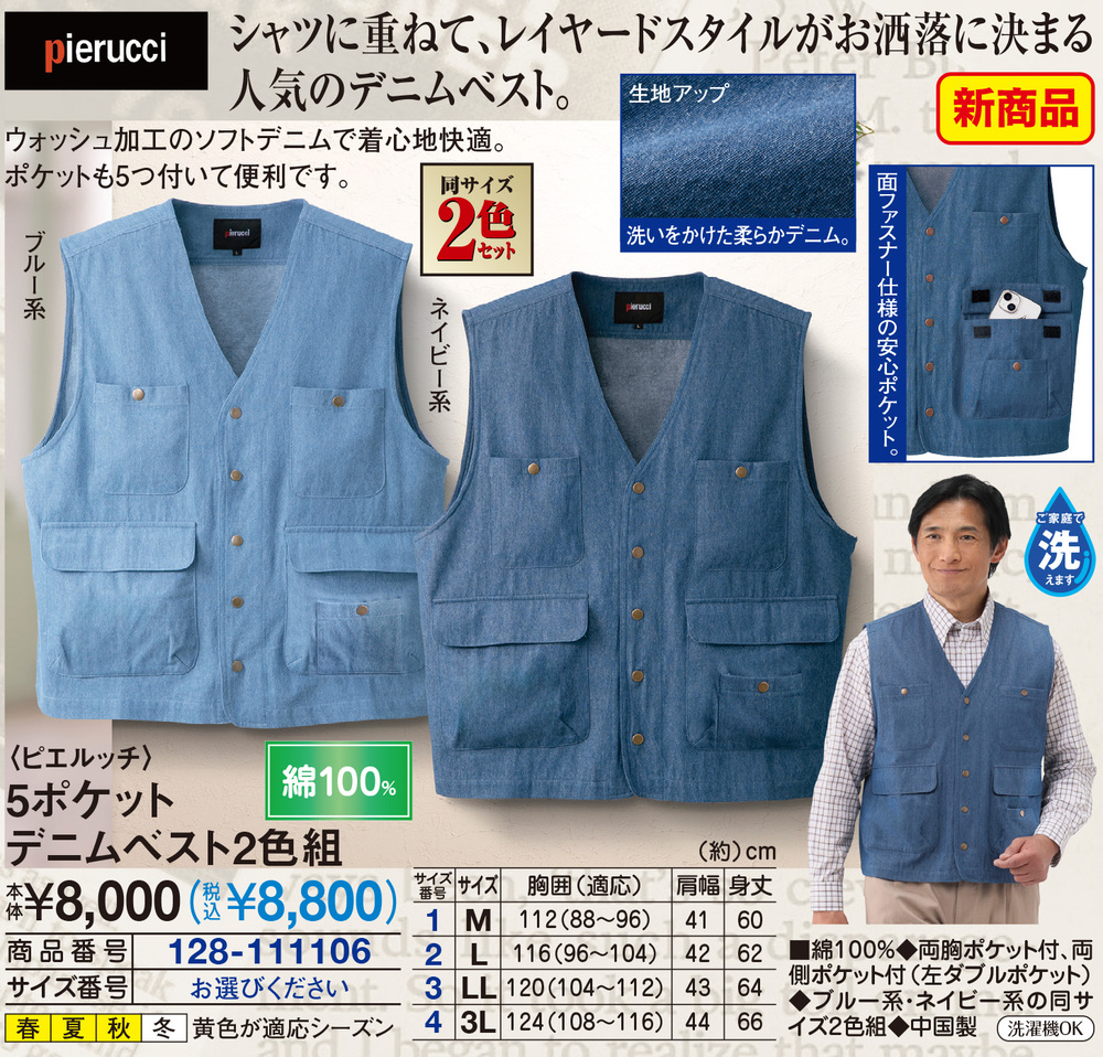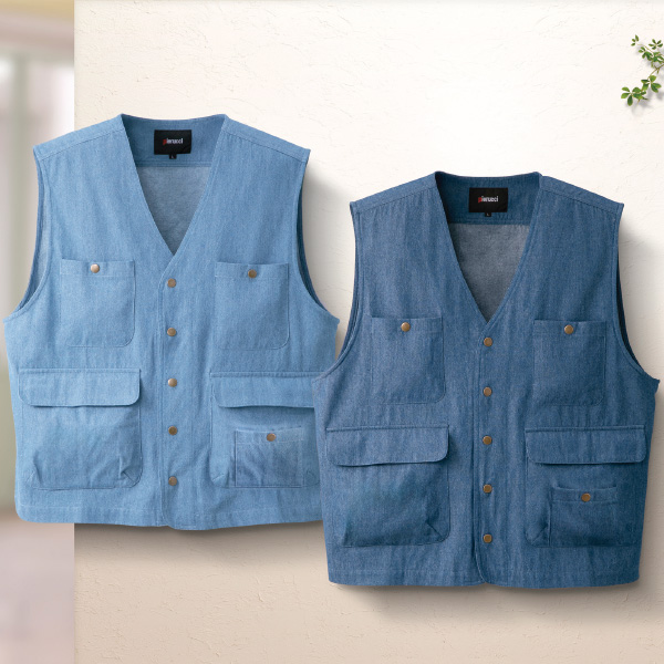 シャツに重ねて、レイヤードスタイルがお洒落に決まる人気のデニムベスト! ウォッシュ加工のソフトデニムで着心地快適。 ポケットも5つ付いて便利です。 洗いをかけた柔らかデニム。 面ファスナー仕様の安心ポケット。 ●同サイズ2色セット