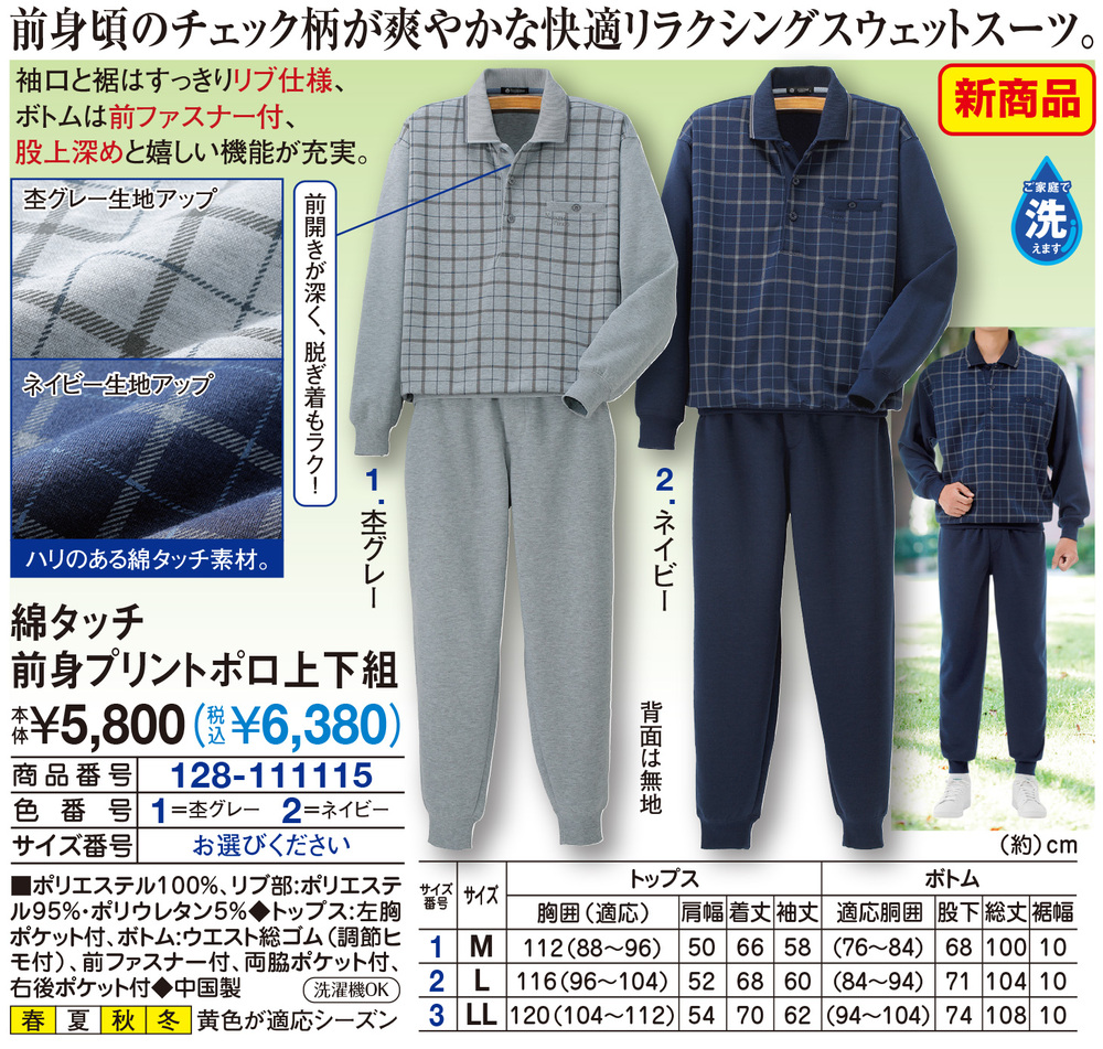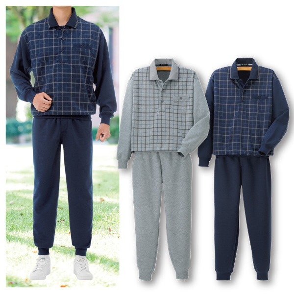 前身頃のチェック柄が爽やかな快適リラクシングスウェットスーツ!