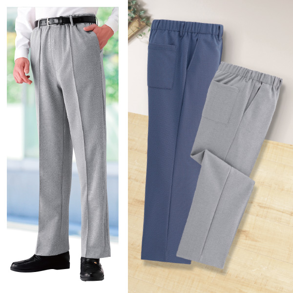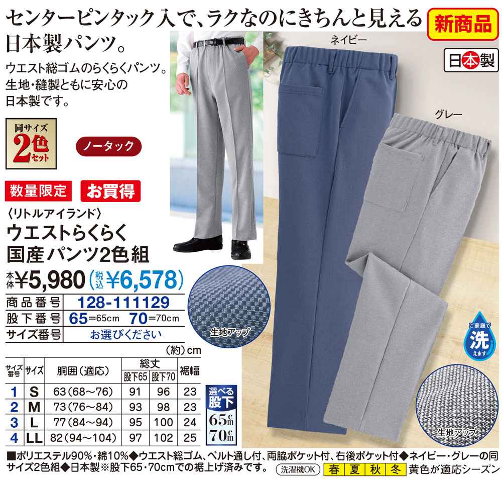 センターピンタック入で、ラクなのにきちんと見える日本製パンツ! ウエスト総ゴムのらくらくパンツ。 生地・縫製ともに安心の日本製です。 ●ノータック ●同サイズ2色セット