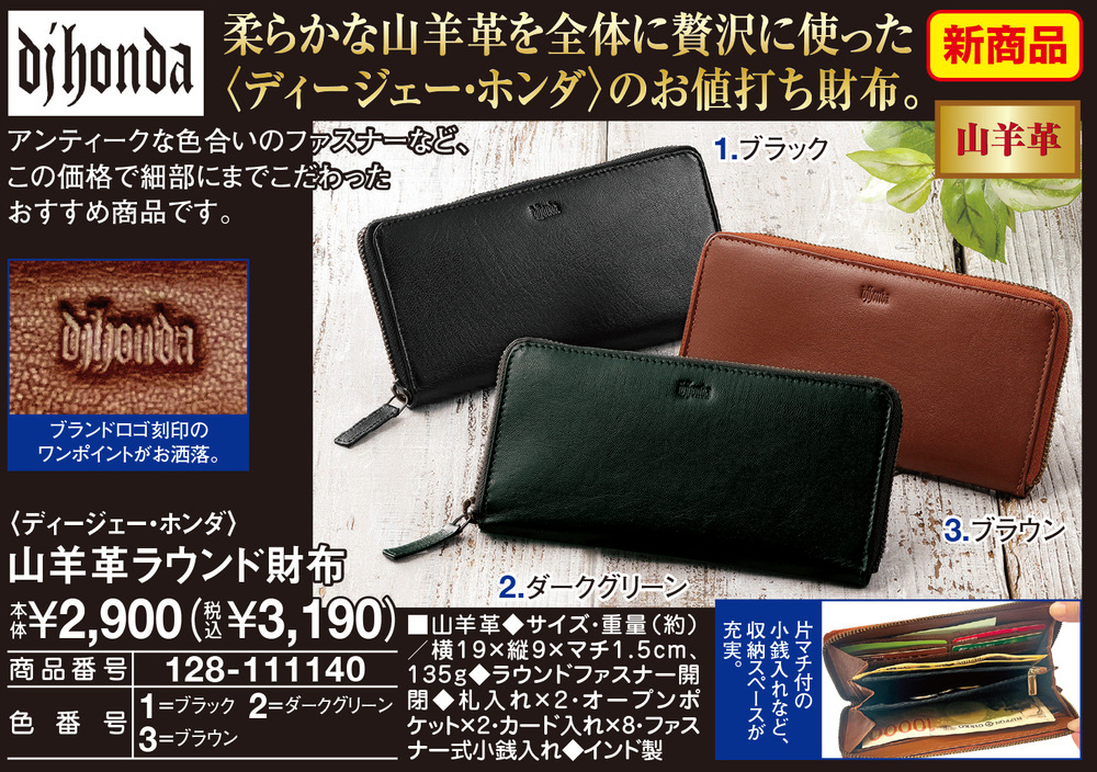 柔らかな山羊革を全体に贅沢に使った<ディージェー・ホンダ>のお値打ち財布! アンティークな色合いのファスナーなど、この価格で細部にまでこだわったおすすめ商品です。 片マチ付の小銭入れなど、収納スペースが充実。 ブランドロゴ刻印のワンポイントがお洒落。 ●山羊革