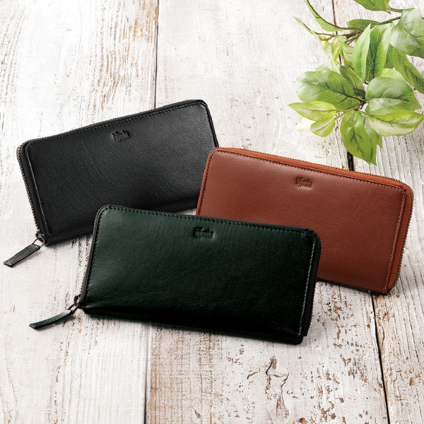 ■山羊革 ◆サイズ・重量(約)/横19×縦9×マチ1.5cm、135g ◆ラウンドファスナー開閉 ◆札入れ×2・オープンポケット×2・カード入れ×8・ファスナー式小銭入れ ◆インド製