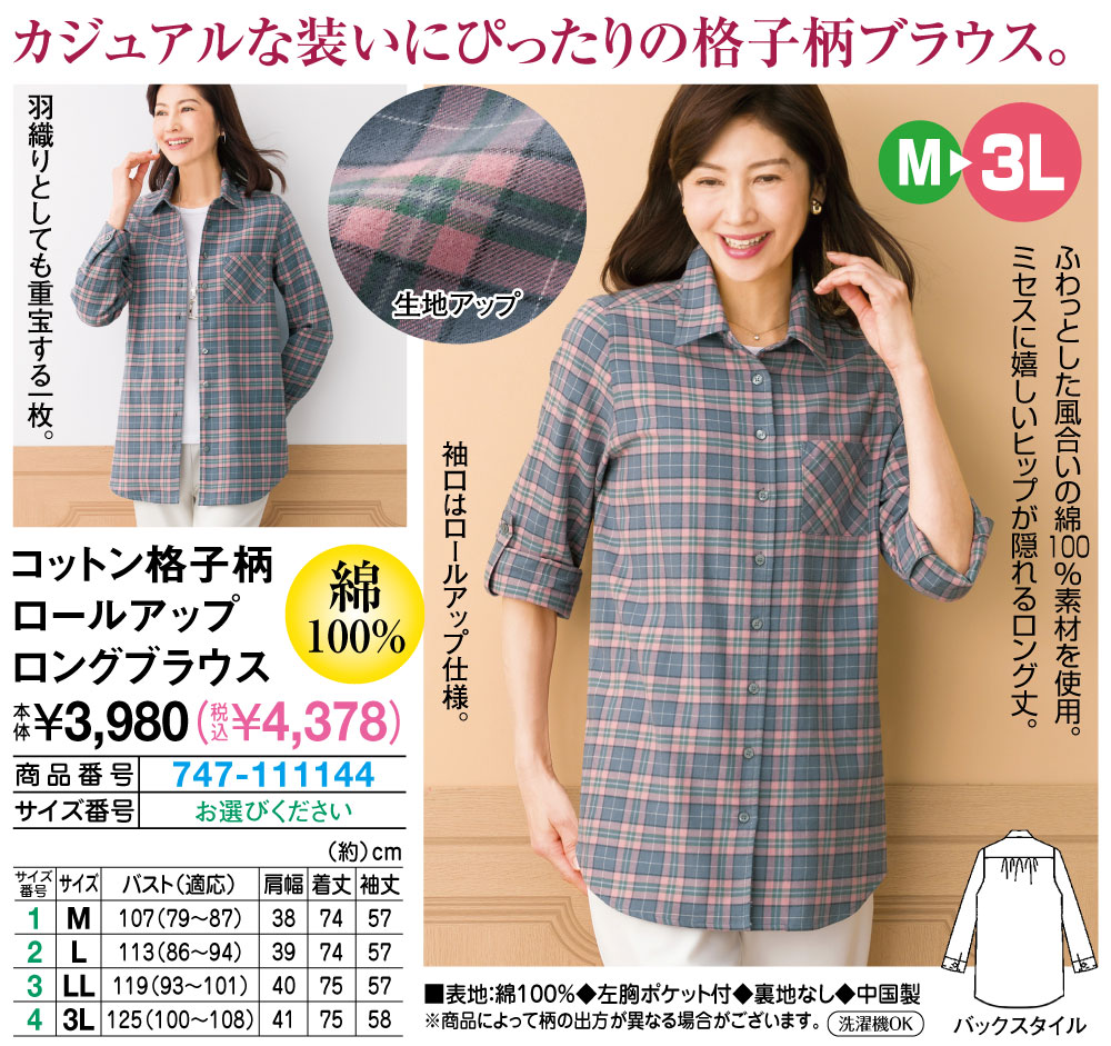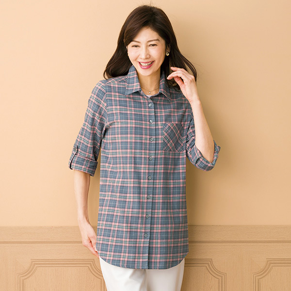 カジュアルな装いにぴったりの格子柄ブラウス! ふわっとした風合いの綿100%素材を使用。 ミセスに嬉しいヒップが隠れるロング丈。 袖口はロールアップ仕様。 羽織りとしても重宝する一枚。 ●M~3L