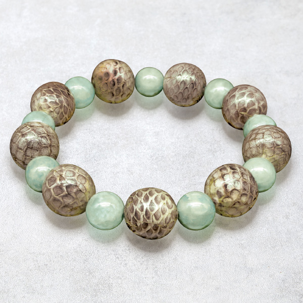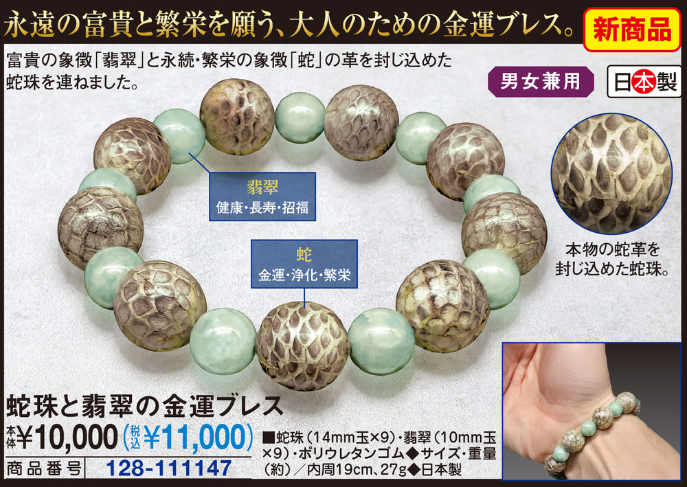 永遠の富貴と繁栄を願う、大人のための金運ブレス! 富貴の象徴「翡翠」と永続・繁栄の象徴「蛇」の革を封じ込めた蛇珠を連ねました。 本物の蛇革を封じ込めた蛇珠。 【翡翠】健康・長寿・招福 【蛇】金運・浄化・繁栄 ●男女兼用