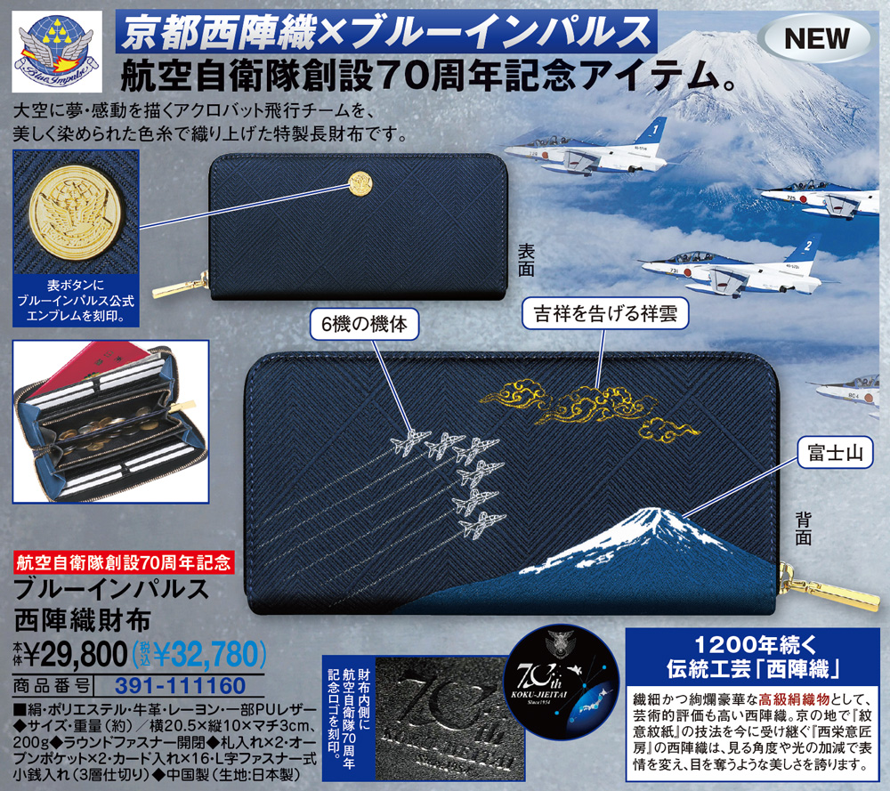 京都西陣織×ブルーインパルス 航空自衛隊創設70周年記念アイテム。 大空に夢・感動を描くアクロバット飛行チームを、 美しく染められた色糸で織り上げた特製長財布です。 表ボタンにブルーインパルス公式エンブレムを刻印。 財布内側に航空自衛隊70周年記念ロゴを刻印。 1200年続く伝統工芸「西陣織」 繊細かつ絢爛豪華な高級絹織物として、芸術的評価も高い西陣織。 京の地で『紋意紋紙』の技法を今に受け継ぐ『西栄意匠房』の西陣織は、見る角度や光の加減で表情を変え、目を奪うような美しさを誇ります。