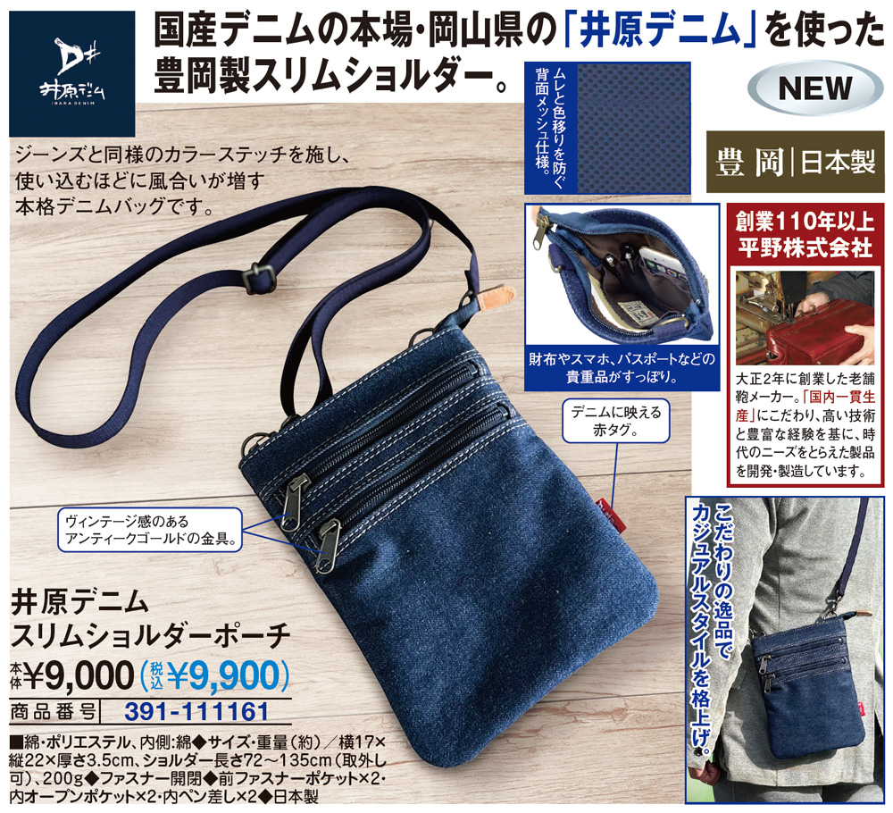 国産デニムの本場・岡山県の「井原デニム」を使った豊岡製スリムショルダー。 ジーンズと同様のカラーステッチを施し、使い込むほどに風合いが増す本格デニムバッグです。 ムレと色移りを防ぐ背面メッシュ仕様。 財布やスマホ、パスポートなどの貴重品がすっぽり。 デニムに映える赤タグ。 ヴィンテージ感のあるアンティークゴールドの金具。 こだわりの逸品でカジュアルスタイルを格上げ。 創業110年以上平野株式会社 大正2年に創業した老舗鞄メーカー。 「国内一貫生産」にこだわり、高い技術と豊富な経験を基に、時代のニーズをとらえた製品を開発・製造しています。
