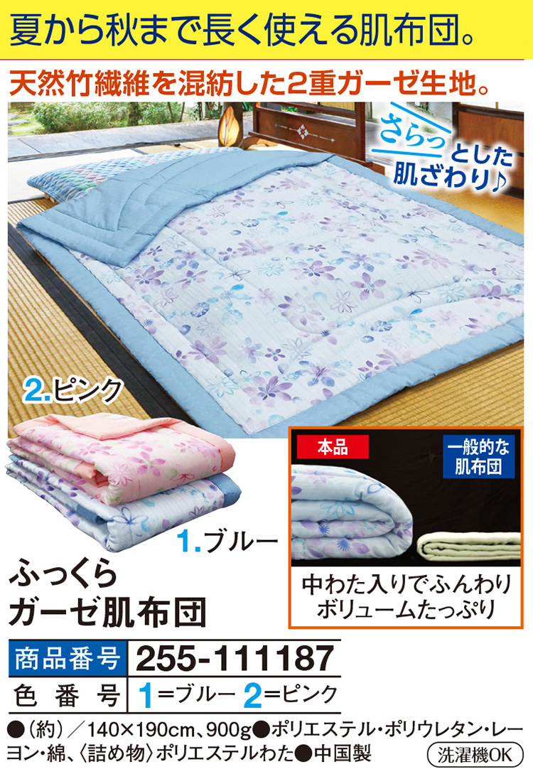 夏から秋まで長く使える肌布団! 天然竹繊維を混紡した2重ガーゼ生地。 さらっとした肌ざわり! 中わた入りでふんわりボリュームたっぷり