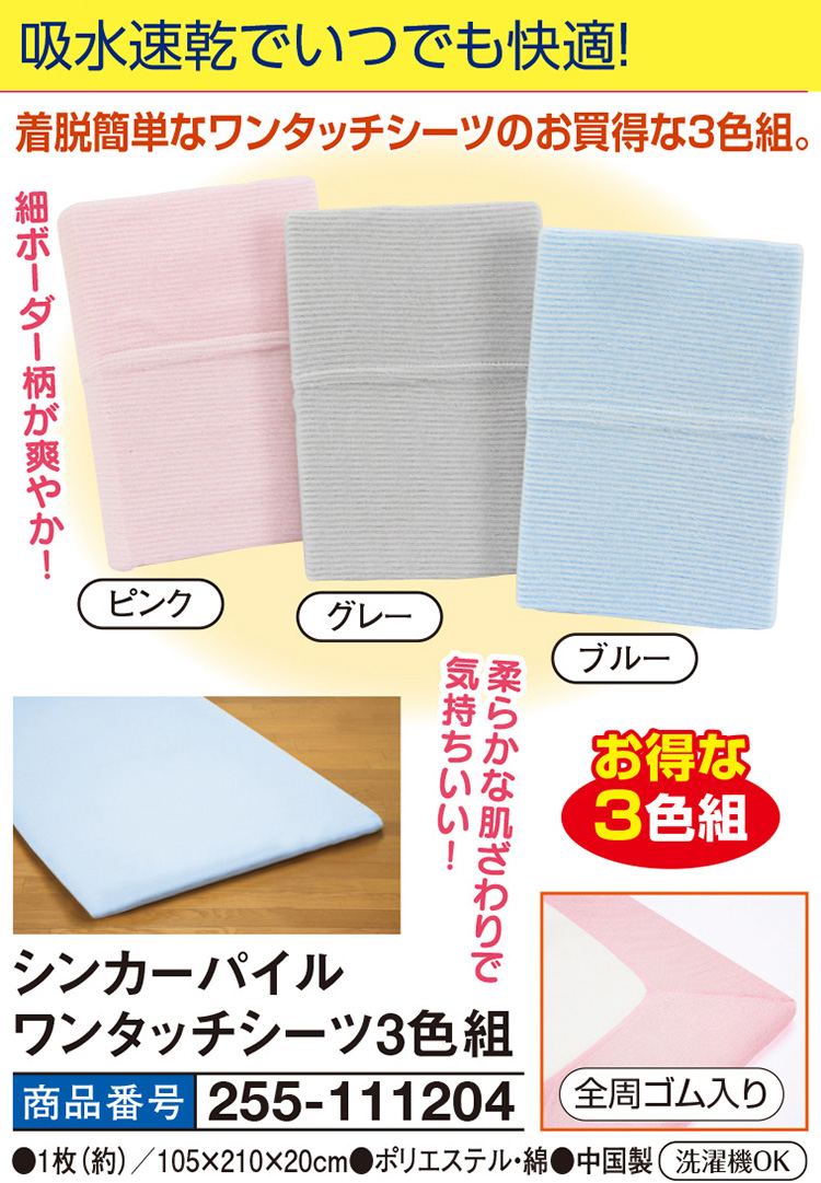 吸水速乾でいつでも快適! 着脱簡単なワンタッチシーツのお買得な3色組。 細ボーダー柄が爽やか! 柔らかな肌ざわりで気持ちいい! 全周ゴム入り ●お買得な3色組