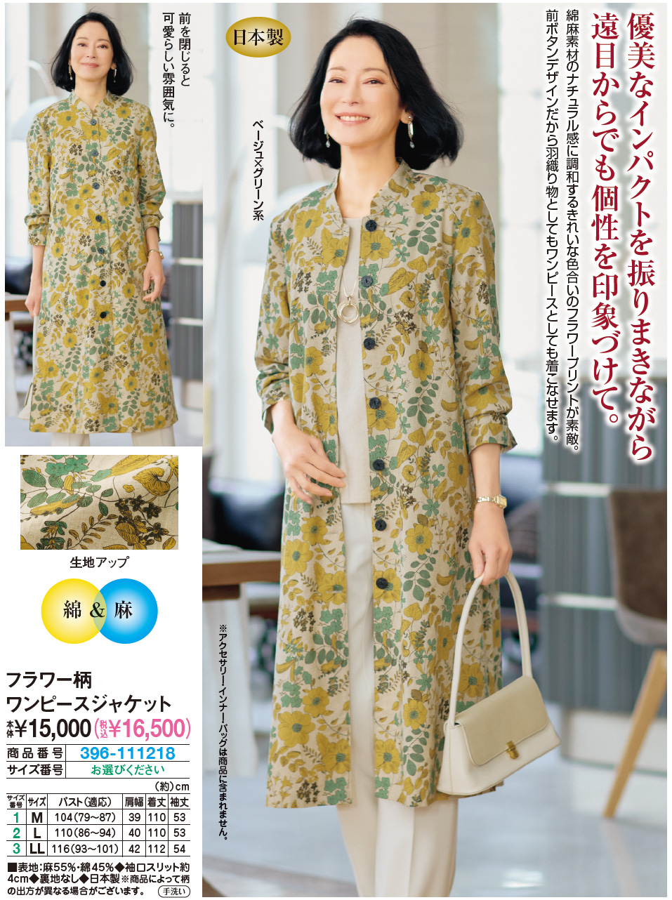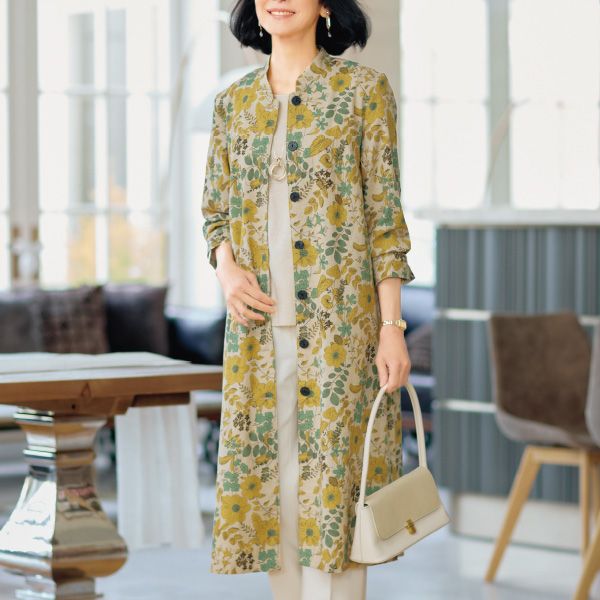 優美なインパクトを振りまきながら遠目からでも個性を印象づけて。 綿麻素材のナチュラル感に調和するきれいな色合いのフラワープリントが素敵。 前ボタンデザインだから羽織り物としてもワンピースとしても着こなせます。