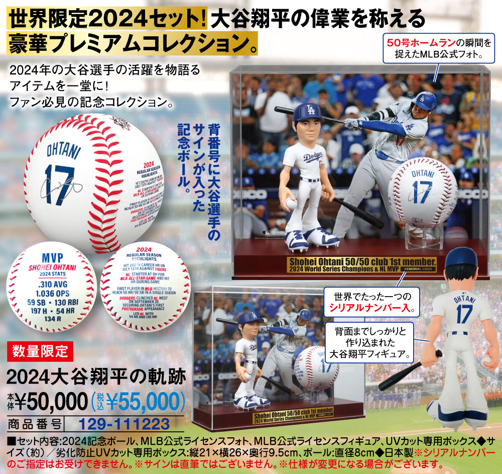 世界限定2024セット!大谷翔平の偉業を称える豪華プレミアムコレクション! 2024年の大谷選手の活躍を物語るアイテムを一堂に!ファン必見の記念コレクション。 50号ホームランの瞬間を捉えたMLB公式フォト。 世界でたった一つのシリアルナンバー入。 背面までしっかりと作り込まれた大谷翔平フィギュア。 背番号に大谷選手のサインが入った記念ボール。