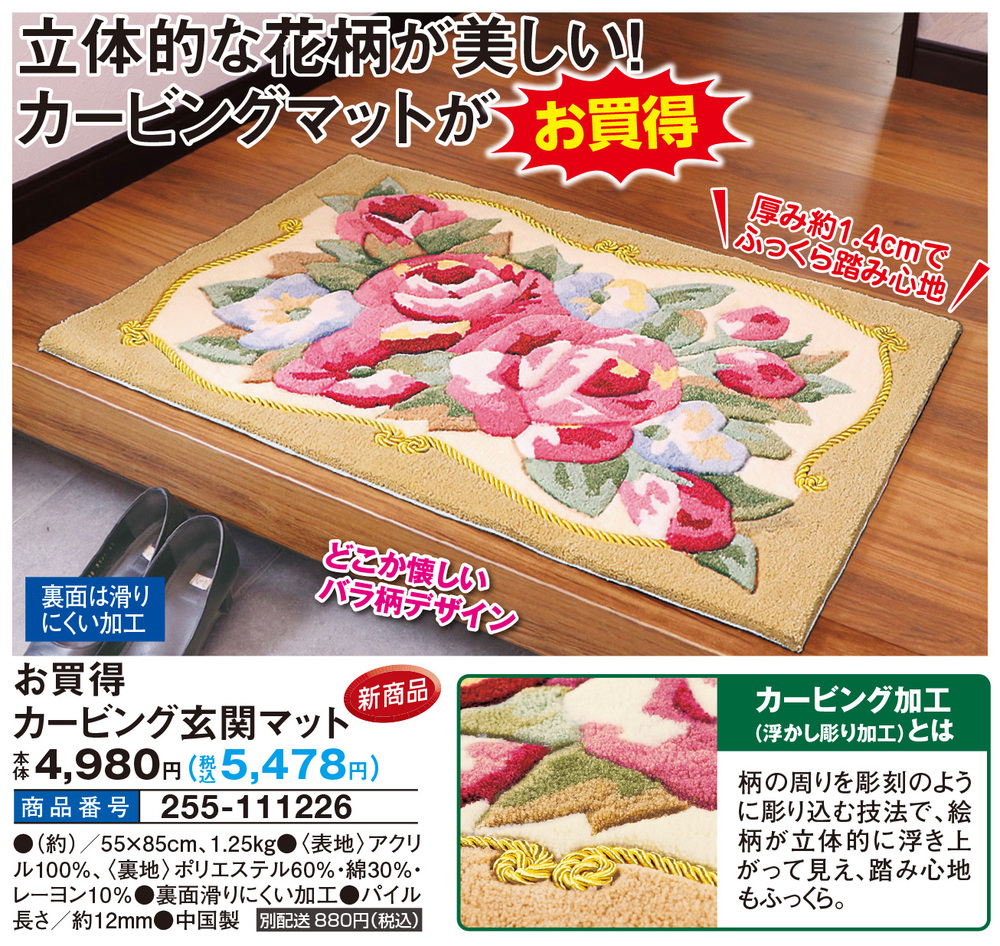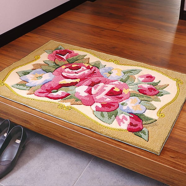立体的な花柄が美しい!カービングマットがお買い得! 厚み約1.4cmでふっくら踏み心地! どこか懐しいバラ柄デザイン。 ●裏面は滑りにくい加工 【カービング加工(浮かし彫り加工)とは】 柄の周りを彫刻のように彫り込む技法で、絵柄が立体的に浮き上がって見え、踏み心地もふっくら。