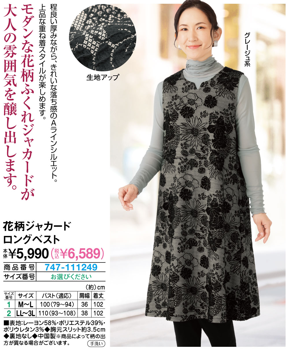 【サイズ(約)】 バスト(適応)、肩幅、着丈 <M~L>100(79~94)cm、36cm、102cm <LL~3L>110(93~108)cm、38cm、102cm ■表地:レーヨン58%・ポリエステル39%・ポリウレタン3% ◆胸元スリット約3.5cm ◆裏地なし ◆中国製