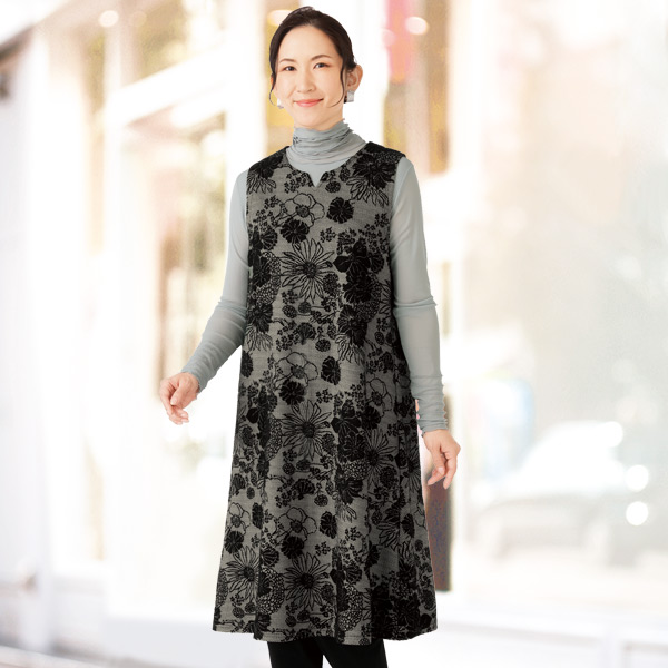 モダンな花柄ふくれジャカードが大人の雰囲気を醸し出します! 程良い厚みながら、きれいな落ち感のAラインシルエット。 上品な重ね着スタイルが楽しめます。