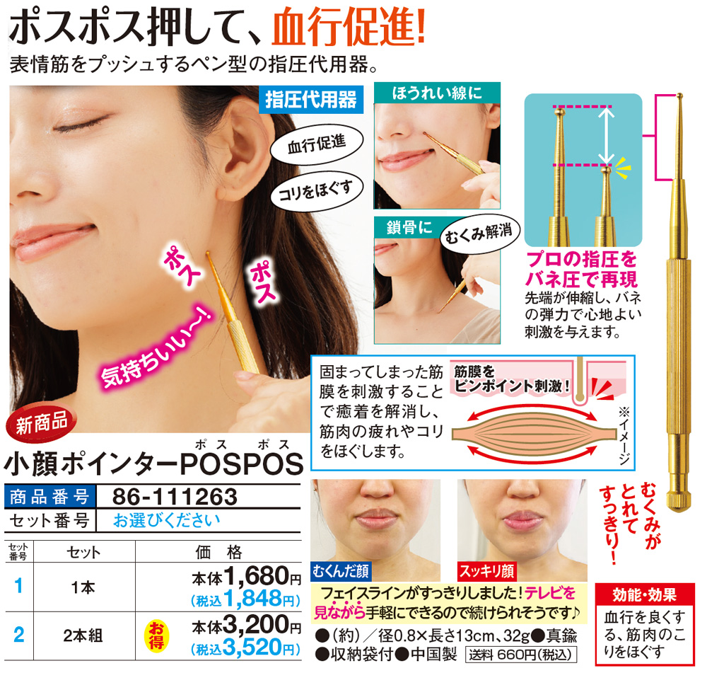 ポスポス押して、血行促進! 【フェイスラインケア】 \秋の夜長に…/おうちケアグッズ 表情筋をプッシュするペン型の指圧代用器。 【指圧代用器】 ●血行促進 ●コリをほぐす ●ほうれい線に ●鎖骨に ●むくみ解消 プロの指圧をバネ圧で再現。 先端が伸縮し、バネの弾力で心地よい刺激を与えます。 固まってしまった筋膜を刺激することで癒着を解消し、筋肉の疲れやコリをほぐします。 筋膜をピンポイント刺激! 気持ちいい~! むくみがとれてすっきりー! フェイスラインがすっきりしました!テレビを見ながら手軽にできるので続けられそうです♪ ●効果・効能:血行を良くする、筋肉のこりをほぐす。