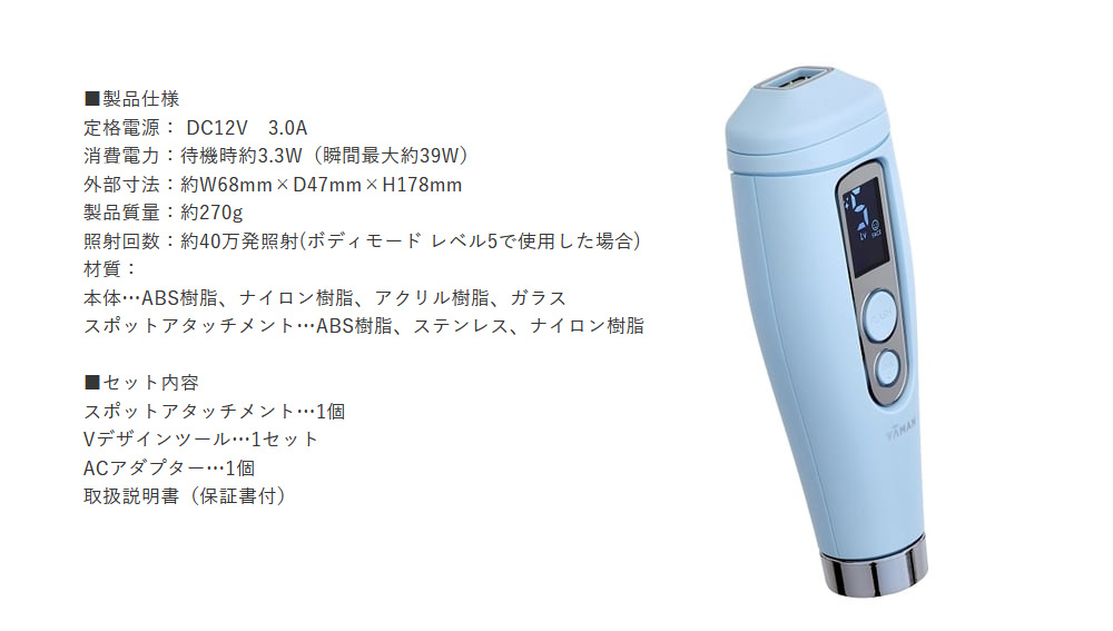 ■製品仕様 定格電源: DC12V 3.0A 消費電力:待機時約3.3W(瞬間最大約39W) 外部寸法:約W68mm×D47mm×H178mm 製品質量:約270g 照射回数:約40万発照射(ボディモード レベル5で使用した場合) 材質: 本体…ABS樹脂、ナイロン樹脂、アクリル樹脂、ガラス スポットアタッチメント…ABS樹脂、ステンレス、ナイロン樹脂 ■セット内容 スポットアタッチメント…1個 Vデザインツール…1セット ACアダプター…1個 取扱説明書(保証書付)