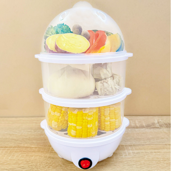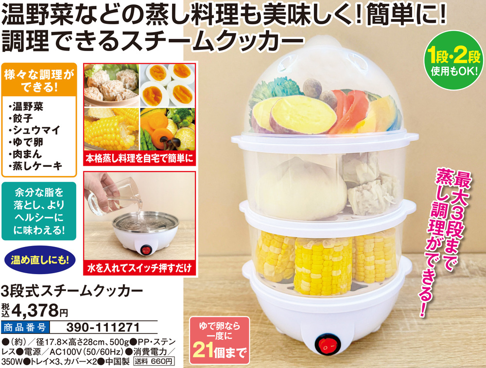 ●最大3段まで蒸し調理ができる! ●本格蒸し料理を自宅で簡単に ●水を入れてスイッチ押すだけ ●余分な脂を落とし、よりヘルシーに味わえる! ●ゆで卵なら一度に21個まで 【様々な調理ができる!】 ・温野菜 ・餃子 ・シュウマイ ・ゆで卵 ・肉まん ・蒸しケーキ