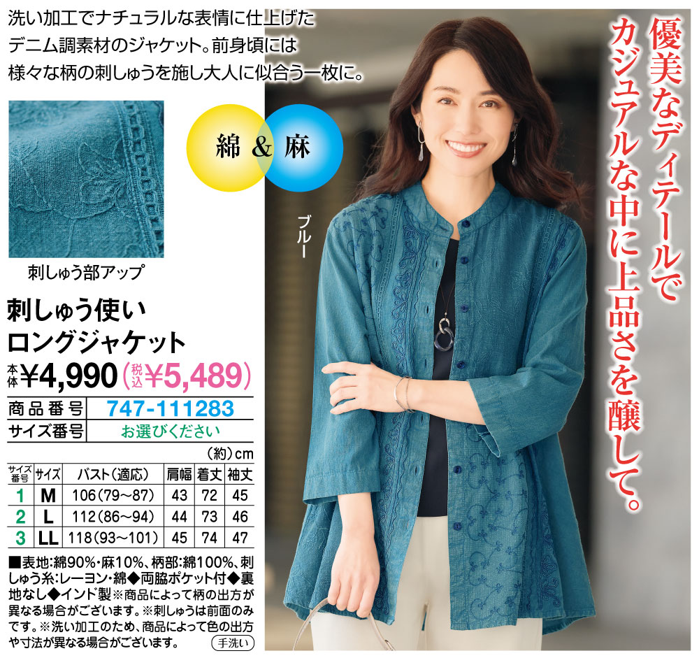 前身頃には様々な柄の刺しゅうを施し大人に似合う一枚に。