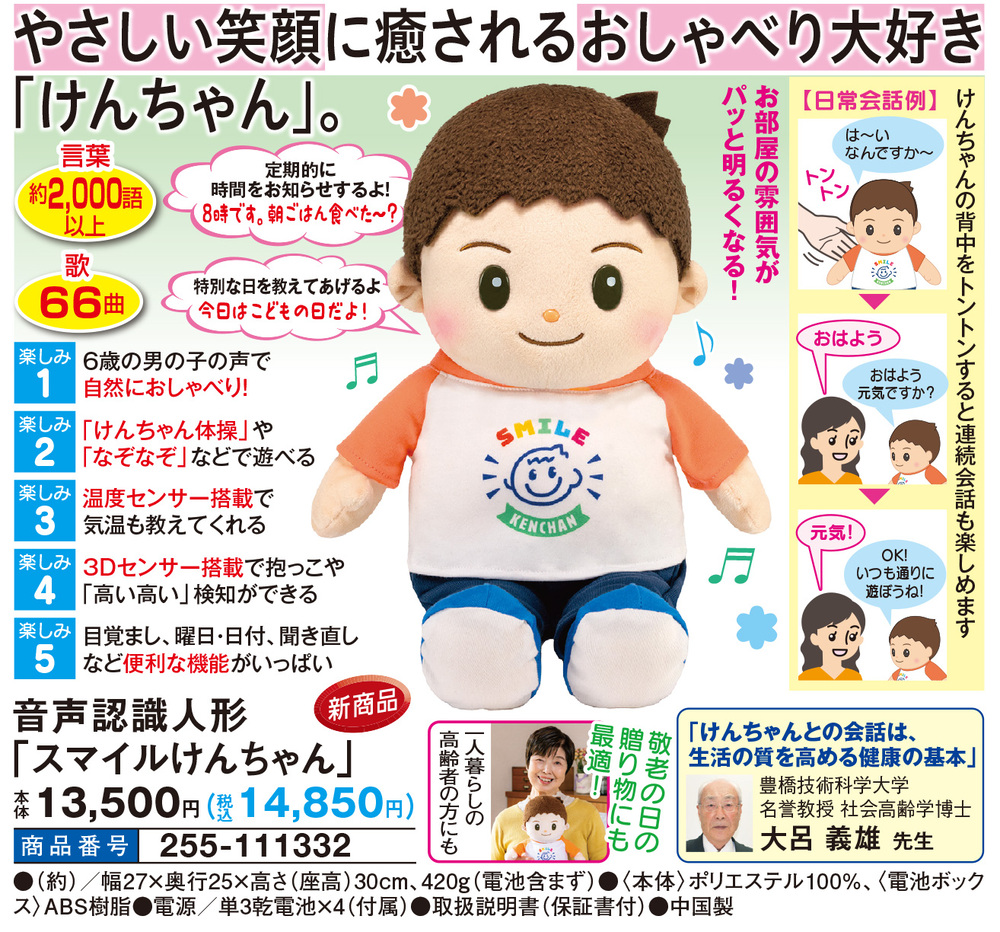 やさしい笑顔に癒されるおしゃべり大好き「けんちゃん」! お部屋の雰囲気がパッと明るくなる! けんちゃんの背中をトントンすると連続会話も楽しめます ●言葉約2000語以上 ●歌66曲 定期的に時間をお知らせするよ! 「8時です。朝ごはん食べた~?」 特別な日を教えてあげるよ 「今日はこどもの日だよ!」 楽しみ1 6歳の男の子の声で自然におしゃべり! 楽しみ2 「けんちゃん体操」や「なぞなぞ」などで遊べる 楽しみ3 温度センサー搭載で気温も教えてくれる 楽しみ4 3Dセンサー搭載で抱っこや「高い高い」検知ができる 楽しみ5 目覚まし、曜日・日付、聞き直しなど便利な機能がいっぱい 敬老の日の贈り物にも最適! 一 人暮らしの高齢者の方にも 【けんちゃんとの会話は、生活の質を高める健康の基本】 豊橋技術科学大学 名誉教授 社会高齢学博士 大呂 義雄 先生