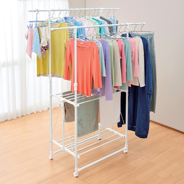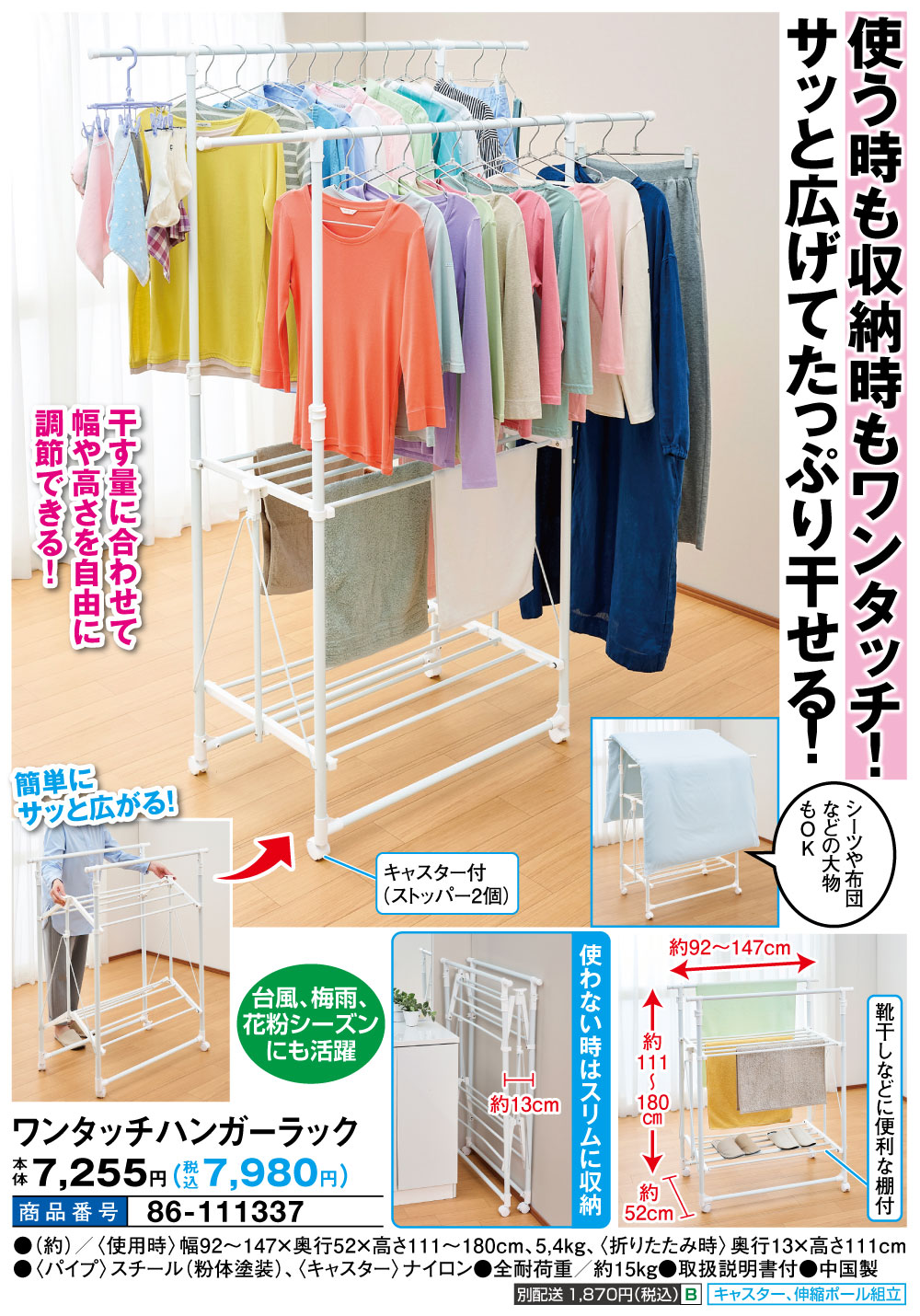 使う時も収納時もワンタッチ!サッと広げてたっぷり干せる! 干す量に合わせて幅や高さを自由に調節できる! 簡単にサッと広がる! シーツや布団などの大物もOK ・靴干しなどに便利な棚付 ・キャスター付(ストッパー2個) ●台風、梅雨、花粉シーズンにも活躍 使わない時はスリムに収納