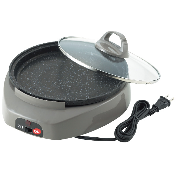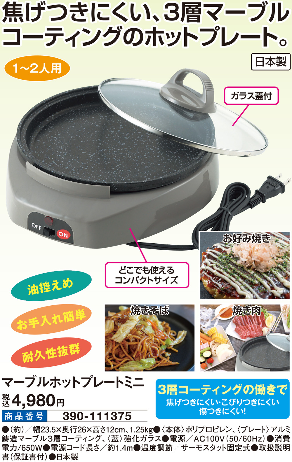 ●(約)/幅23.5×奥行26×高さ12cm、1.25kg ●<本体>ポリプロピレン、<プレート>アルミ鋳造マーブル3層コーティング、<蓋>強化ガラス ●電源/AC100V(50/60Hz) ●消費電力/650W ●電源コード長さ/約1.4m ●温度調節/サーモスタット固定式 ●取扱説明書(保証書付) ●日本製
