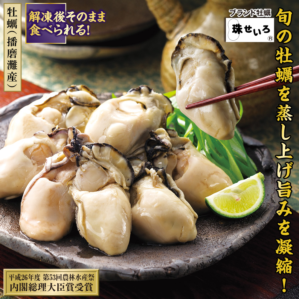 【牡蠣(播磨灘産)】 解凍後そのまま食べられる! 蒸し方は特許製法。せいろ蒸しのようなやさしい蒸気で牡蠣をふっくら蒸し上げました。 色々なお料理にもご使用できます。 平成26年度 第53回農林水産祭 内閣総理大臣賞受賞