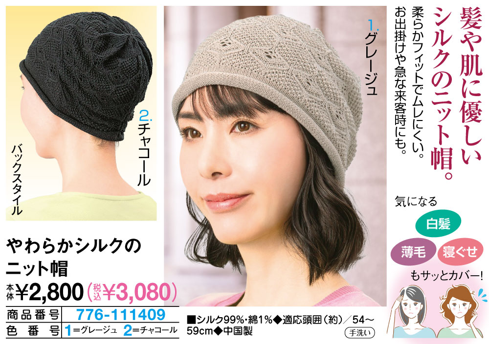 髪や肌に優しいシルクのニット帽! 柔らかフィットでムレにくい。 お出掛けや急な来客時にも。 気になる白髪、薄毛、寝ぐせもサッとカバー!