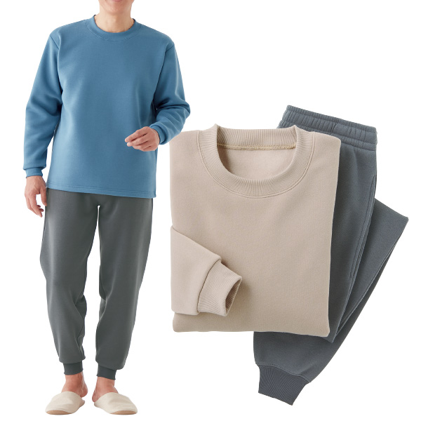 軽くて暖かな裏起毛のメンズパジャマ! 上下違いの配色で、リラックスウェアにもおすすめです。 ふんわり暖か! 袖口・裾はリブ仕様で冷気をシャットアウト。 ●ふんわり優しい肌触り。 ●スマホも入る両脇ポケット付。 ●裏起毛