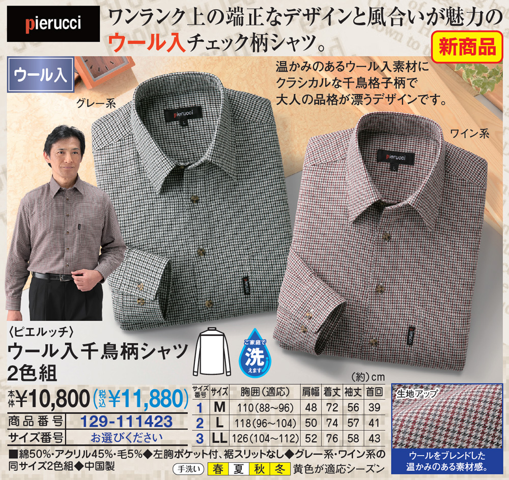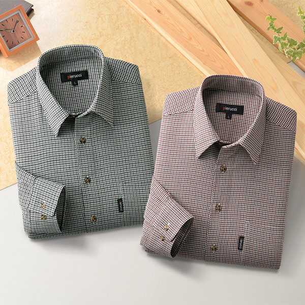 ワンランク上の端正なデザインと風合いが魅力のウール入チェック柄シャツ! 温かみのあるウール入素材にクラシカルな千鳥格子柄で大人の品格が漂うデザインです。 ウールをブレンドした温かみのある素材感。 ●ウール入