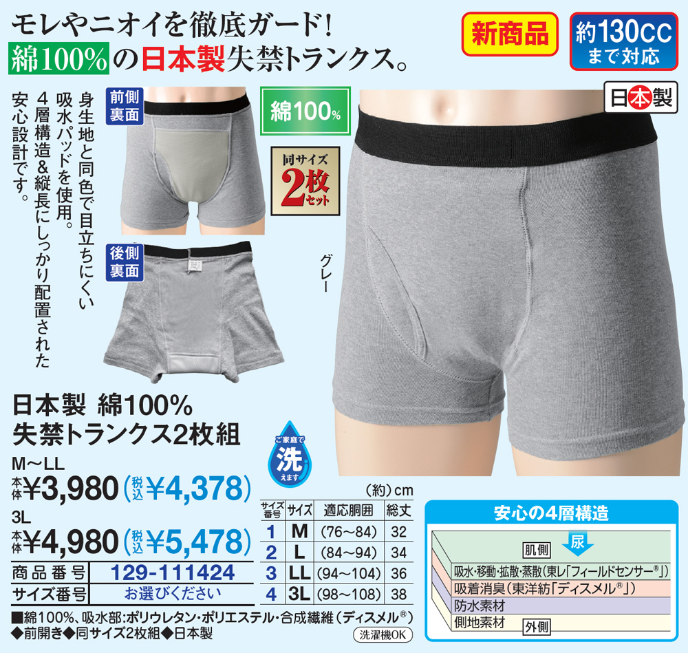 モレやニオイを徹底ガード!綿100%の日本製失禁トランクス! 身生地と同色で目立ちにくい吸水パッドを使用。 4層構造&縦長にしっかり配置された安心設計です。 安心の4層構造 吸水・移動・拡散・蒸散(東レ「フィールドセンサー(R)」) 吸着消臭(東洋紡「ディスメル(R)」) 防水素材 側地素材 ●同サイズ2枚セット ●約130CCまで対応