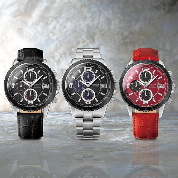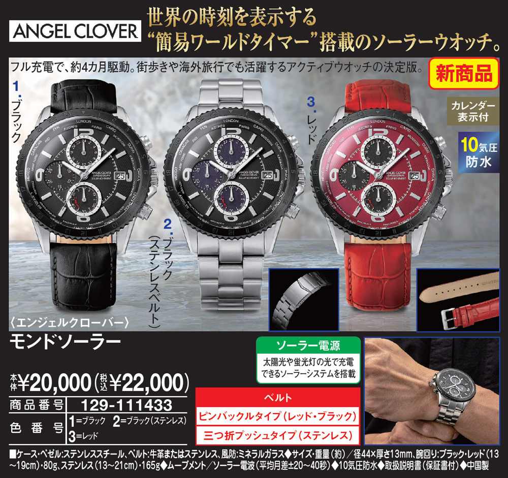 世界の時刻を表示する“簡易ワールドタイマー”搭載のソーラーウオッチ! フル充電で、約4カ月駆動。 街歩きや海外旅行でも活躍するアクティブウオッチの決定版。 【ソーラー電源】 太陽光や蛍光灯の光で充電できるソーラーシステムを搭載 【ベルト 】 ●ピンバックルタイプ(レッド・ブラック) ●三つ折プッシュタイプ(ステンレス) ●カレンダー表示付 ●10気圧防水