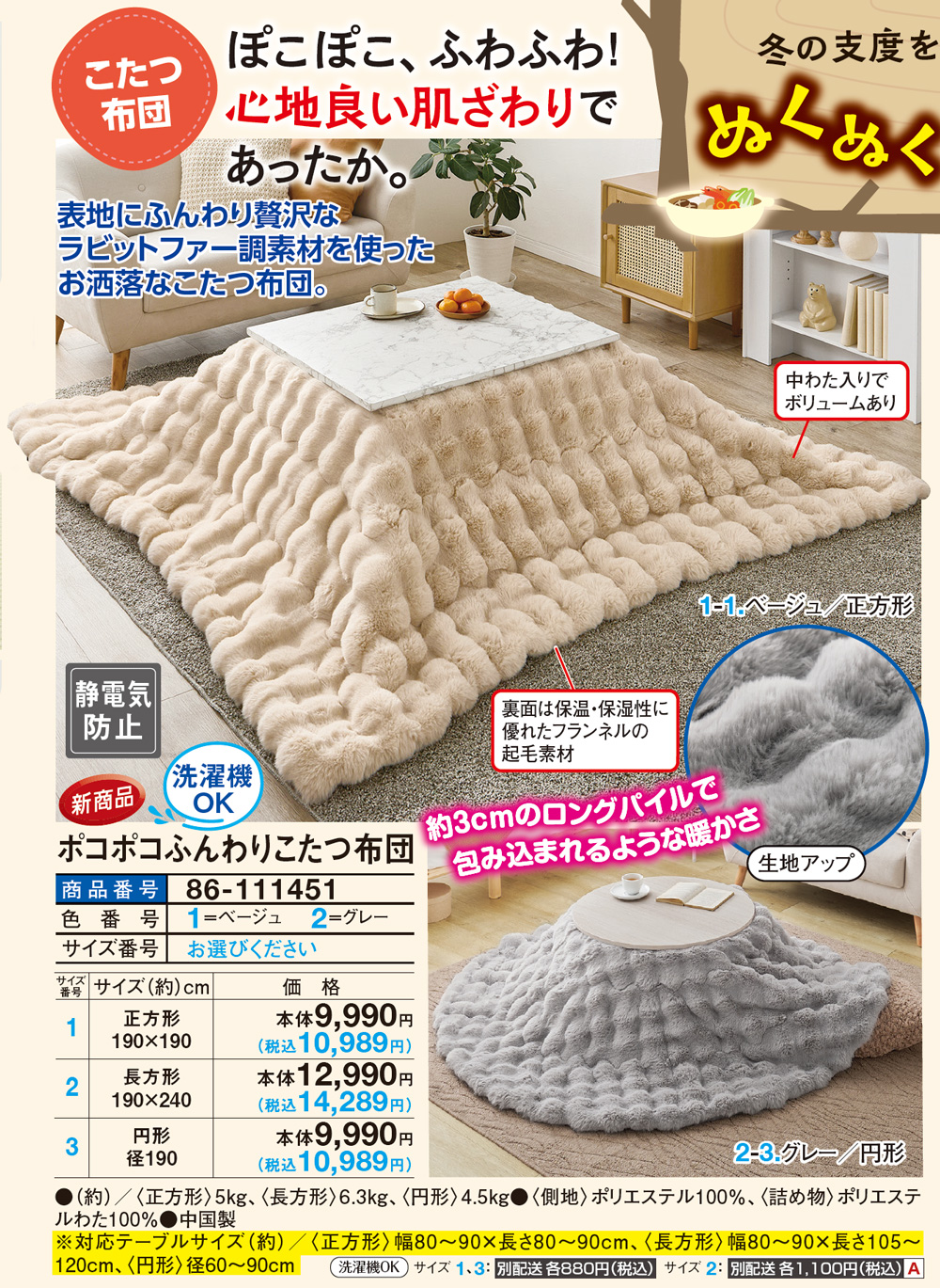 ぽこぽこ、ふわふわ!心地良い肌ざわりであったか! 冬の支度を始めよう♪ ぬくぬくこたつ 表地にふんわり贅沢なラビットファー調素材を使ったお洒落なこたつ布団。 裏面は保温・保湿性に優れたフランネルの起毛素材。 約3cmのロングパイルで包み込まれるような暖かさ。 ●中わた入りでボリュームあり ●静電気防止