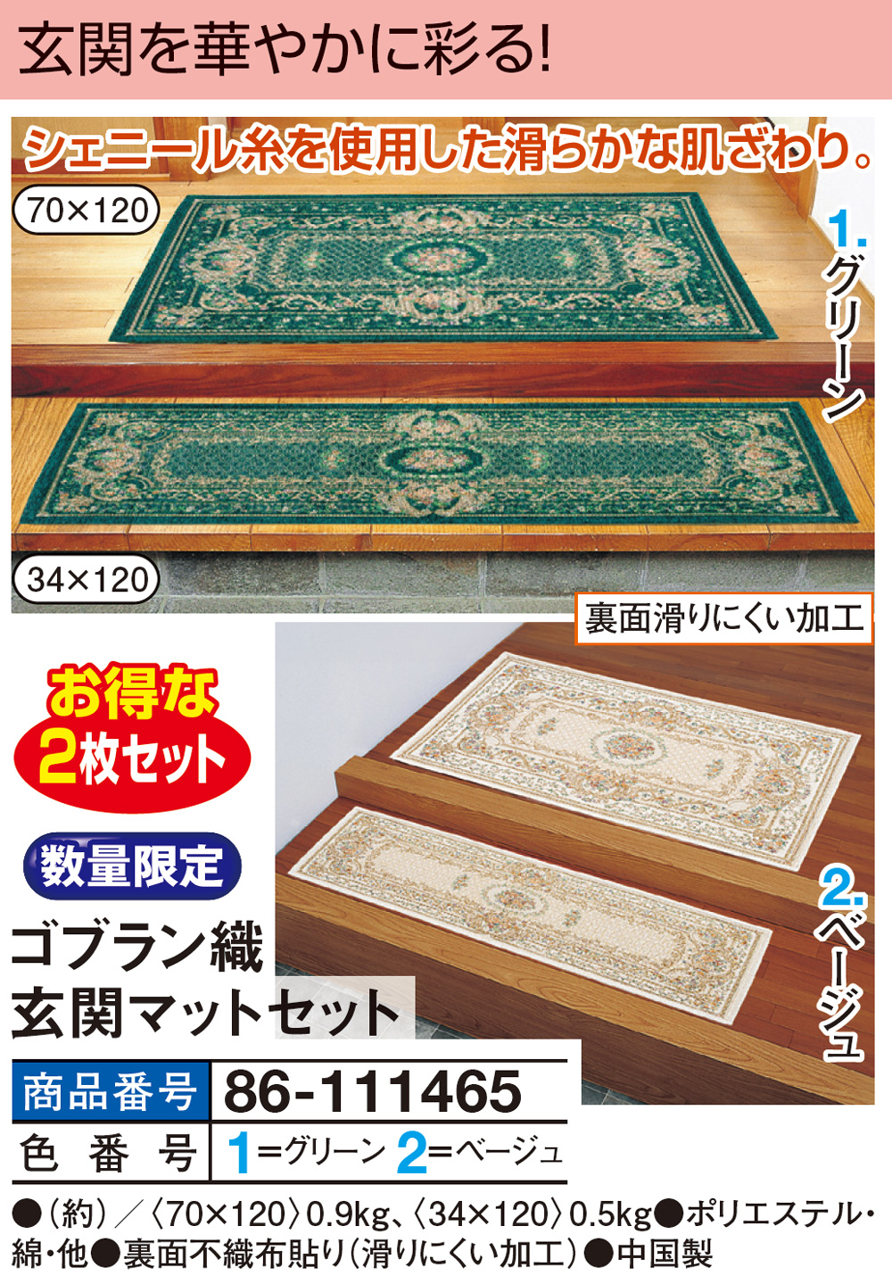 ●(約)/<70×120>0.9kg、<34×120>0.5kg ●ポリエステル・綿・他 ●裏面不織布貼り(滑りにくい加工) ●中国製