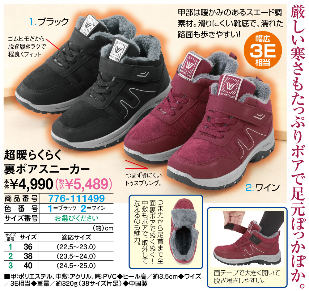厳しい寒さもたっぷりボアで足元ぽっかぽか! 甲部は暖かみのあるスエード調素材。 滑りにくい靴底で、濡れた路面も歩きやすい! ゴムヒモだから脱ぎ履きラクで程良くフィット つまずきにくいトゥスプリング。 つま先から足首まで全面裏ボアでぬくぬく! 中敷もボアで、取外して洗えるのも魅力。 面テープで大きく開いて脱ぎ履きしやすい。 ●幅広3E相当