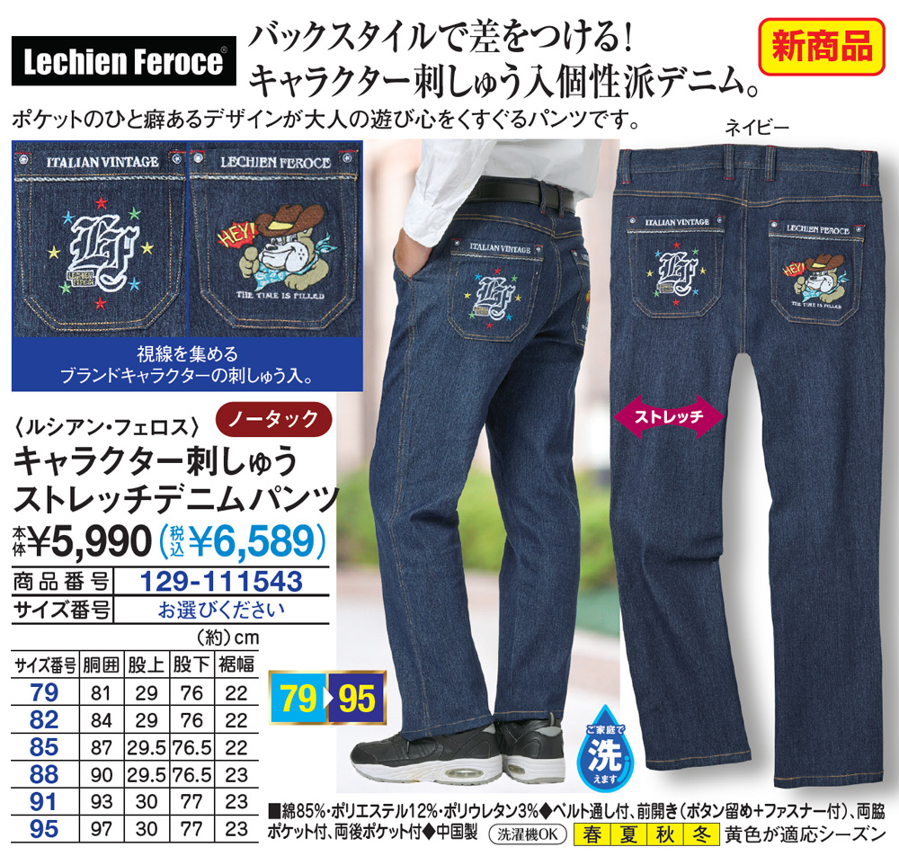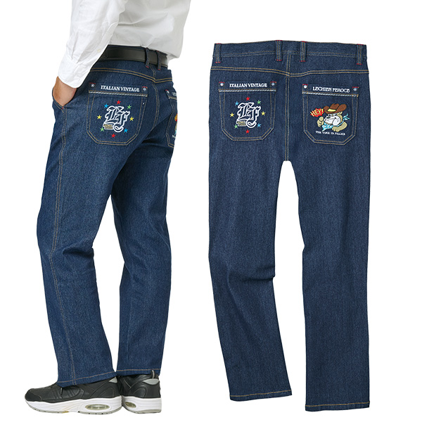 バックスタイルで差をつける!キャラクター刺しゅう入個性派デニム! ポケットのひと癖あるデザインが大人の遊び心をくすぐるパンツです。 視線を集めるブランドキャラクターの刺しゅう入。 ●ノータック ●ストレッチ ●79~95