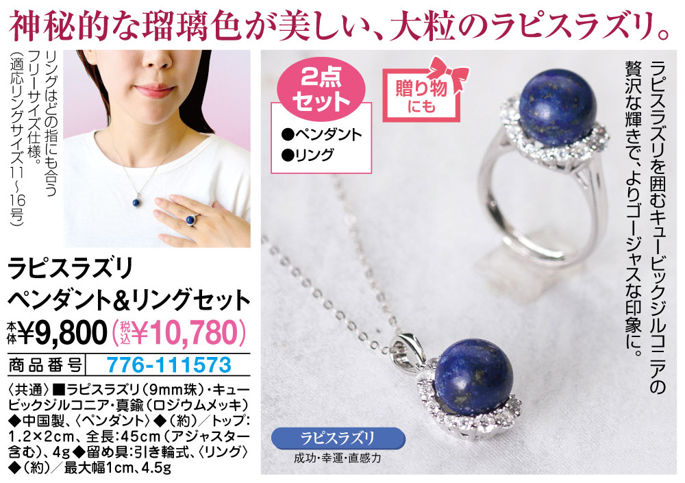 <共通> ■ラピスラズリ(9mm珠)・キュービックジルコニア・真鍮(ロジウムメッキ) ◆中国製 <ペンダント> ◆(約)/トップ:1.2×2cm、全長:45cm(アジャスター含む)、4g ◆留め具:引き輪式 <リング> ◆(約)/最大幅1cm、4.5g