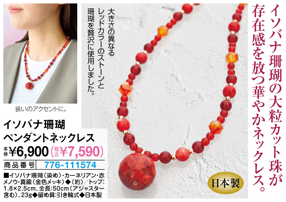 ■イソバナ珊瑚(染め)・カーネリアン・赤メノウ・真鍮(金色メッキ) ◆(約)/トップ:1.8×2.5cm、全長:50cm(アジャスター含む)、23g ◆留め具:引き輪式 ◆日本製