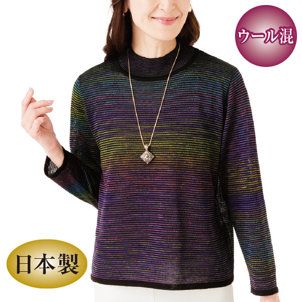 彩り豊かなかすり糸が上品に着映えるハイネックセーター。 一枚でもジャケットを羽織っても女性らしい印象に。 ハイネックなので首元まで暖かです。