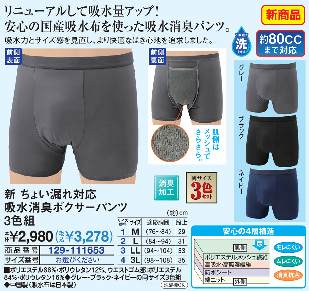 【サイズ(約)】 適応胴囲、股上 <M>(76~84)cm、29cm <L>(84~94)cm、31cm <LL>(94~104)cm、33cm <3L>(98~108)cm、35cm ■ポリエステル88%・ポリウレタン12%、ウエストゴム部:ポリエステル84%、ポリウレタン16% ◆グレー・ブラック・ネイビーの同サイズ3色組 ◆中国製(吸水布は日本製)