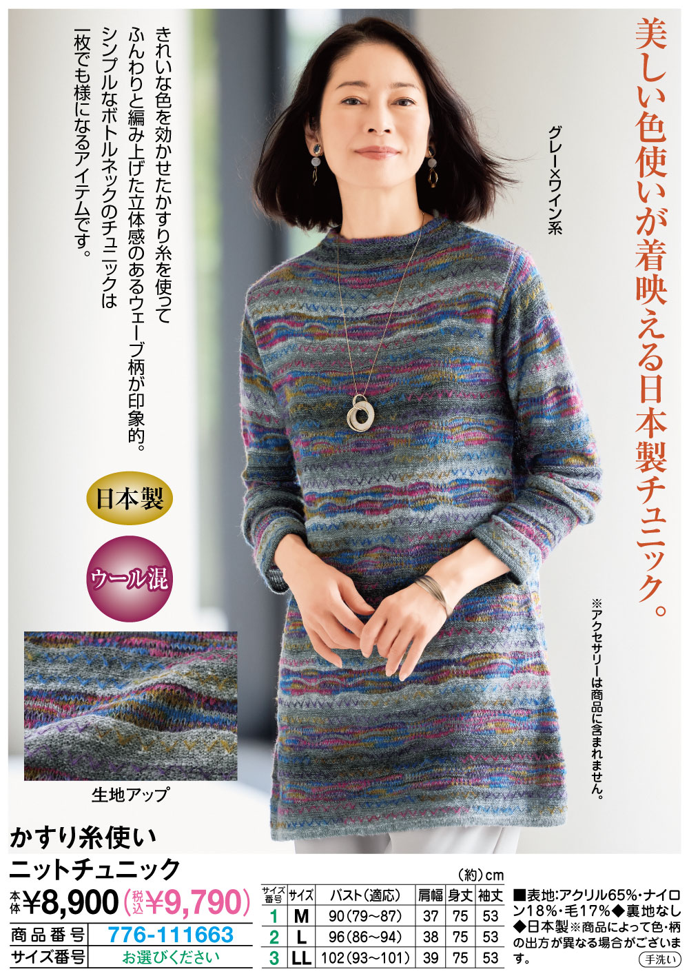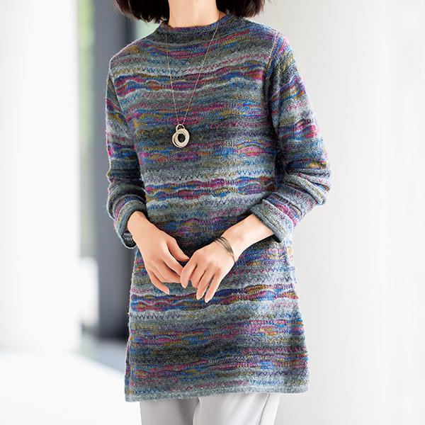 美しい色使いが着映える日本製チュニック! きれいな色を効かせたかすり糸を使ってふんわりと編み上げた立体感のあるウェーブ柄が印象的。 シンプルなボトルネックのチュニックは一枚でも様になるアイテムです。 ●ウール混