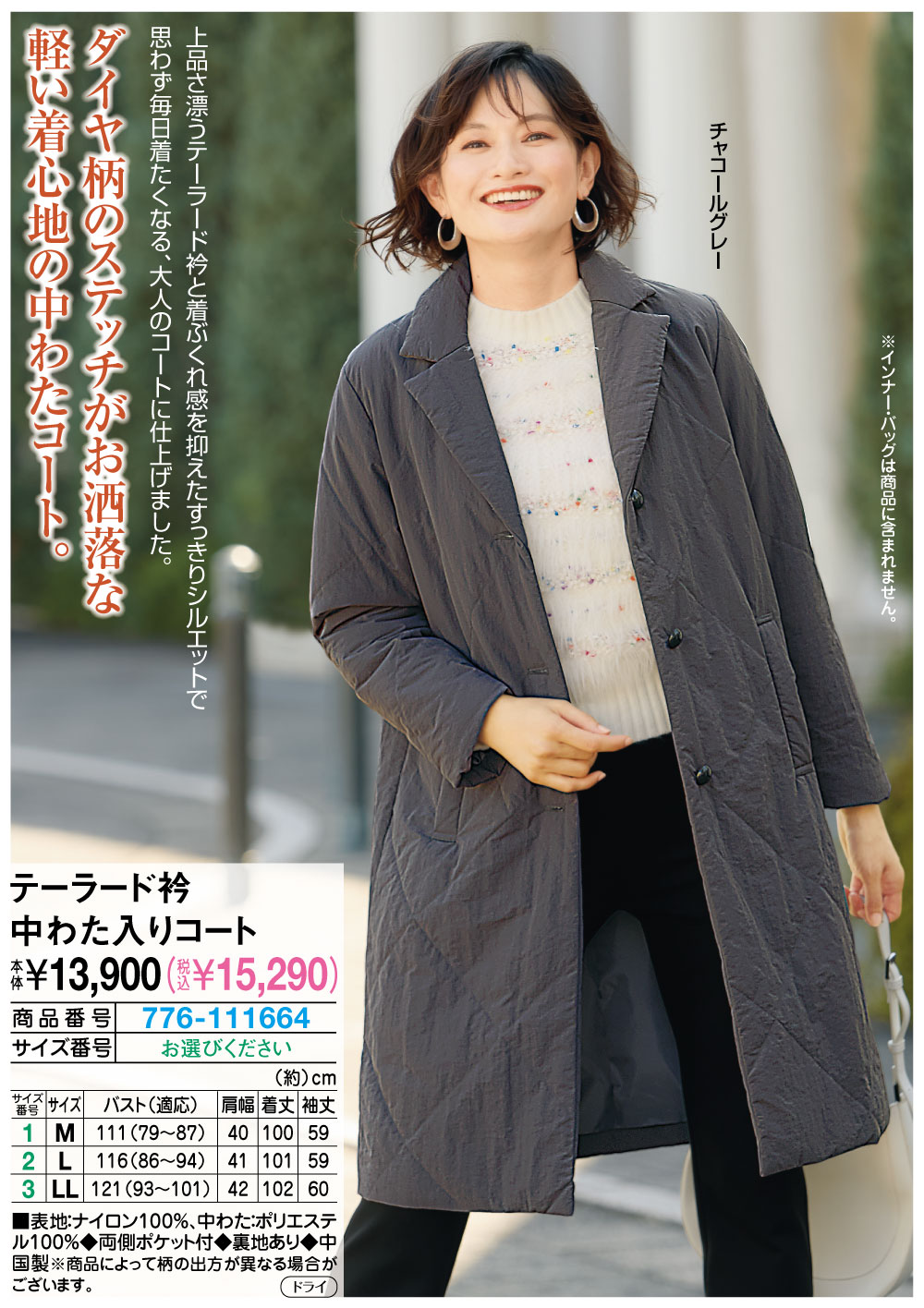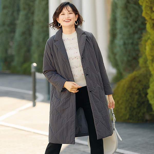 ダイヤ柄のステッチがお洒落な軽い着心地の中わたコート! 上品さ漂うテーラード衿と着ぶくれ感を抑えたすっきりシルエットで思わず毎日着たくなる、大人のコートに仕上げました。