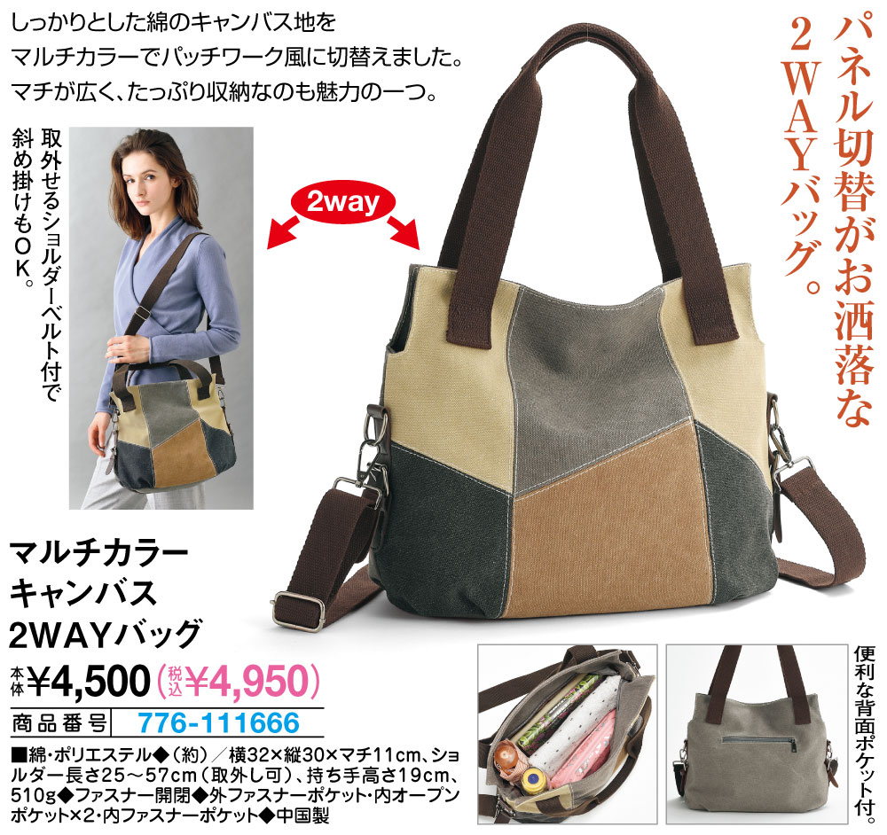 パネル切替がお洒落な2WAYバッグ! しっかりとした綿のキャンバス地をマルチカラーでパッチワーク風に切替えました。 マチが広く、たっぷり収納なのも魅力の一つ。 取外せるショルダーベルト付で斜め掛けもOK。 便利な背面ポケット付。 ●2way